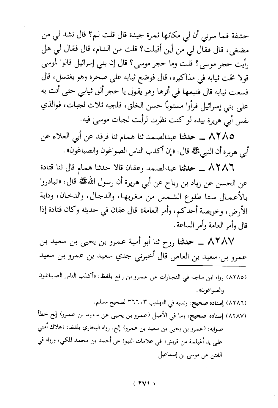 8285 - حدثنا عبد الصمد ثنا همام ثنا فرقد عن أبي العلاء عن أبي هريرة أن النبي -صلي الله عليه وسلم - قال: "إن أكذب الناس الصواغون والصباغون".
