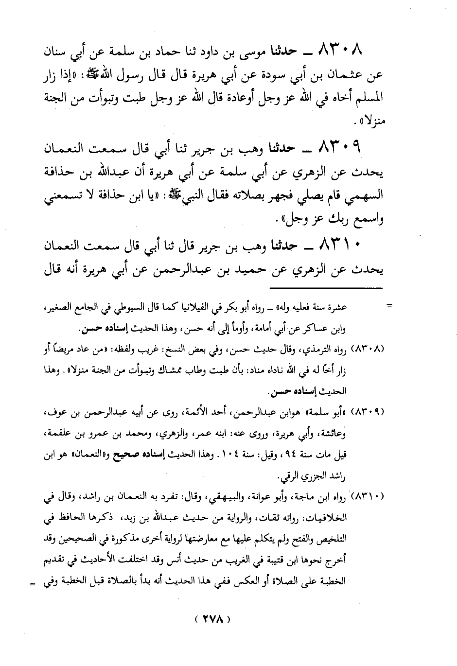 (8309) "أبو سلمة" هو ابن عبد الرحمن، أحد الأئمة، روى عن أبيه عبد الرحمن بن عوف، وعائشة، وأبي هريرة، وروى عنه: ابنه عمر، والزهري، ومحمد بن عمرو بن علقمة، قيل مات سنة 94، وقيل: سنة 104. وهذا الحديث إسناده صحيح و"النعمان" هو ابن راشد الجزري الرقي.