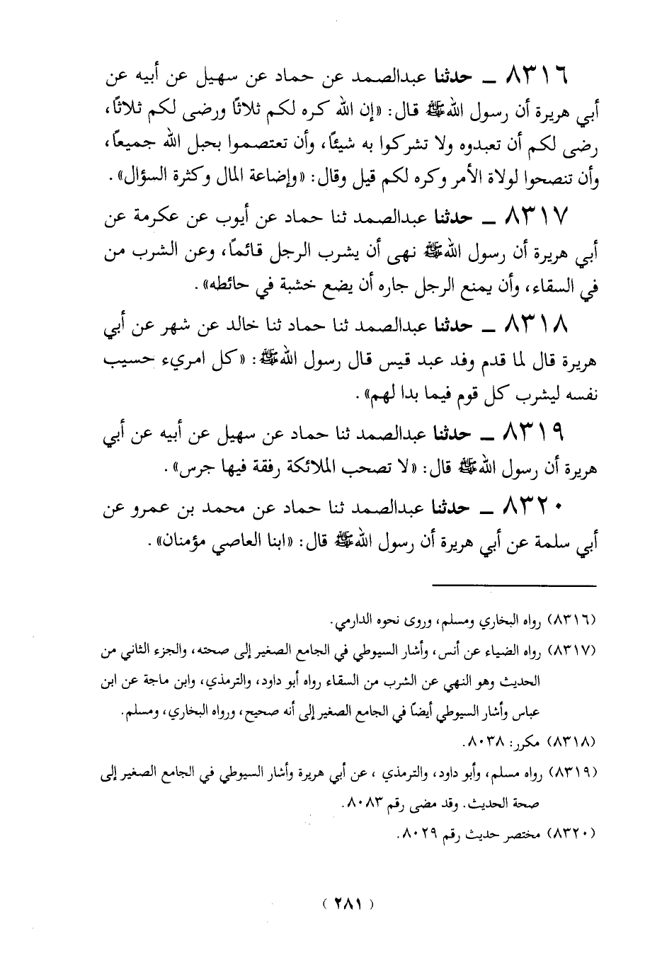 8316 - حدثنا عبد الصمد عن حمّاد عن سهيل عن أبيه عن أبي هريرة أن رسول الله - صلى الله عليه وسلم - قال: "إن الله كره لكم ثلاثاً ورضي لكم ثلاثاً، رضي لكم أن تعبدوه ولا تشركوا به شيئاً، وأن تعتصموا بحبل الله جميعًا، وأن تنصحوا لولاة الأمر وكره لكم قيل وقال: "وإضاعة المال وكثرة السؤال".