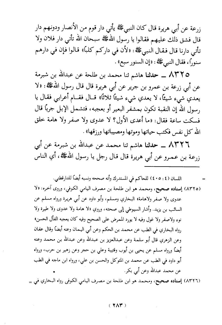 (8325) إسناده صحيح، ومحمد هو ابن طلحة بن مصرف اليامي الكوفي، وروى آخره: "لا عدوى ولا صفر ولاهامة" البخاري ومسلم، وأبو داود عن أبي هريرة ورواه مسلم عن السائب بن يزيد. وأشار السيوطي إلى صحته، وروي "لا هامة ولا عدوى ولا طيرة ولا نوء ولا صفر ولا غول وفيه لا يورد المرض على الصحيح وفيه كان يعجبه الفأل الحسن" رواه البخاري في الطب عن محمَّد بن الحكم وعن أبي اليمان وعنه أيضاً وقال عفان وعن الزهري قال أبو سلمة وعن عبد العزيز بن عبد الله وعن عبد الله بن محمَّد وعنه أيضاً ورواه مسلم عن يحيى بن أيوب وقتببة وعلي بن حجر وعن زهير بن حرب، ورواه أبو داود في الطب عن محمَّد بن المتوكل والحسن بن علي، ورواه ابن ماجه في الطب