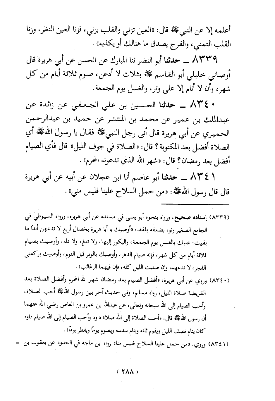 8339 - حدثنا أبو النضر ثنا المبارك عن الحسن عن أبي هريرة قال أوصاني خليلي أبو القاسم - صلى الله عليه وسلم - بثلاث لا أدعن، صوم ثلاثة أيام من كل شهر، وأن لا أنام إلا على وتر، والغسل يوم الجمعة.