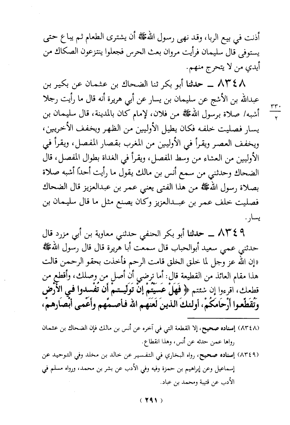 8349 - حدثنا أبو بكر الحنفي حدثني معاوية بن أبي مزرد قال حدثني عمي سعيد أبوالحباب قال سمعت أبا هريرة قال قال رسول الله - صلى الله عليه وسلم - "إن الله عَزَّ وَجَلَّ لما خلق الخلق قامت الرحم فأخذت بحقو الرحمن قالت هذا مقام العائذ من القطيعة قال: أما ترضى أن أصل من وصلك، وأقطع من قطعك، اقرءوا إن شئتم {فَهَلْ عَسَيْتُمْ إِنْ تَوَلَّيْتُمْ أَنْ تُفْسِدُوا فِي الْأَرْضِ وَتُقَطِّعُوا أَرْحَامَكُمْ، أُولَئِكَ الَّذِينَ لَعَنَهُمُ الله فَأَصَمَّهُمْ وَأَعْمَى أَبْصَارَهُمْ،