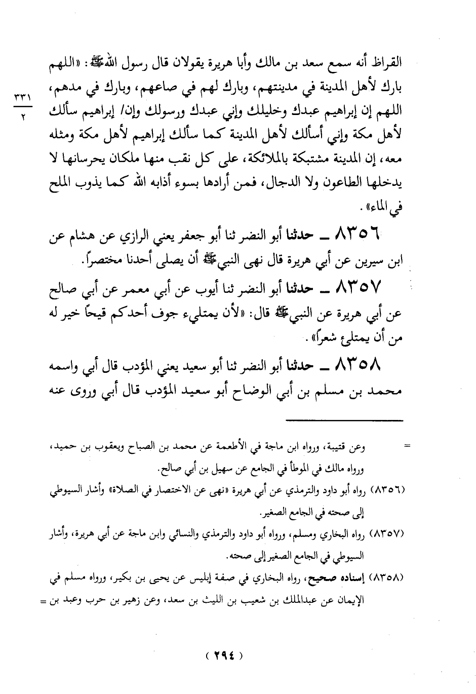 (8357) رواه البخاري ومسلم، ورواه أبو داود والترمذي والنسائي وابن ماجة عن أبي هريرة، أشار السيوطي في الجامع الصغير إلى صحته.