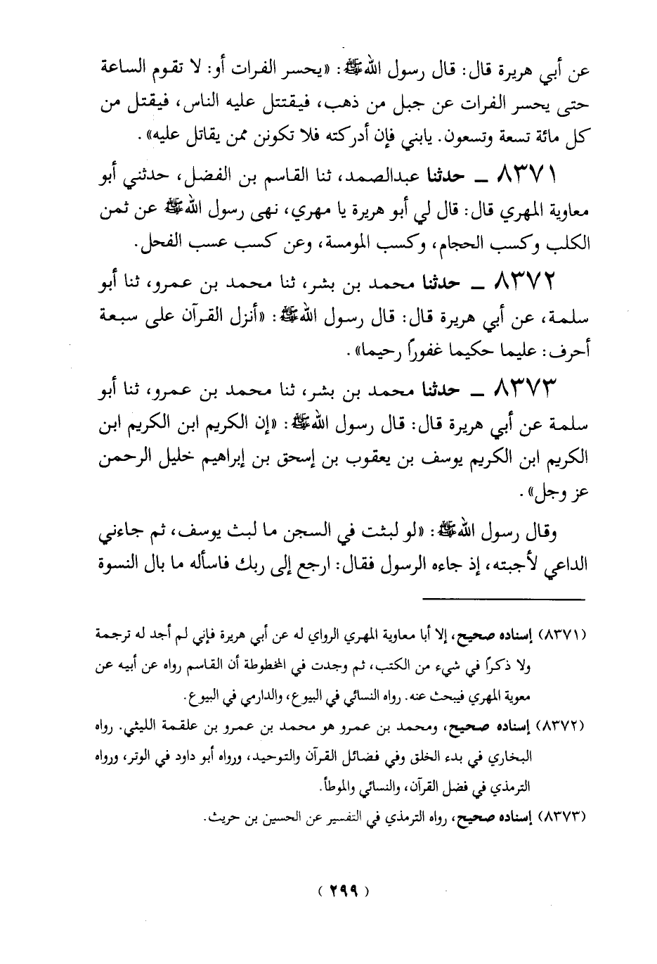 (8372) إسناده صحيح، ومحمد بن عمرو هو محمَّد بن عمرو بن علقمة الليثي. رواه البخاري في بدء الخلق وفي فضائل القرآن والتوحيد، ورواه أبو داود في الوتر، ورواه الترمذي في فضل القرآن، والنسائي والموطأ.