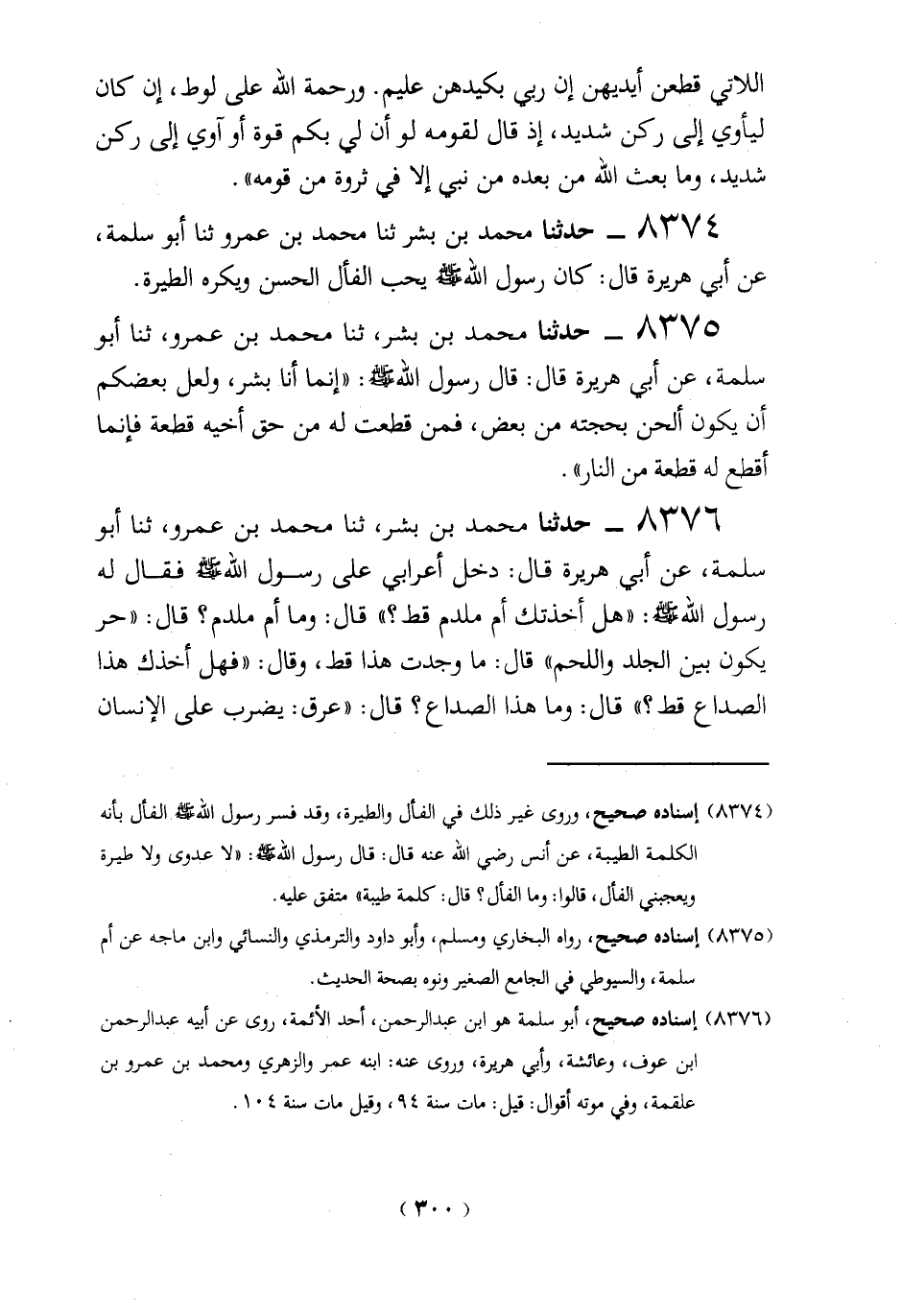 8374 - حدثنا محمَّد بن بشرثنا محمَّد بن عمرو ثنا أبو سلمة، عن أبي هريرة قال: كان رسول الله - صلى الله عليه وسلم - يحب الفأل الحسن ويكره الطيرة.