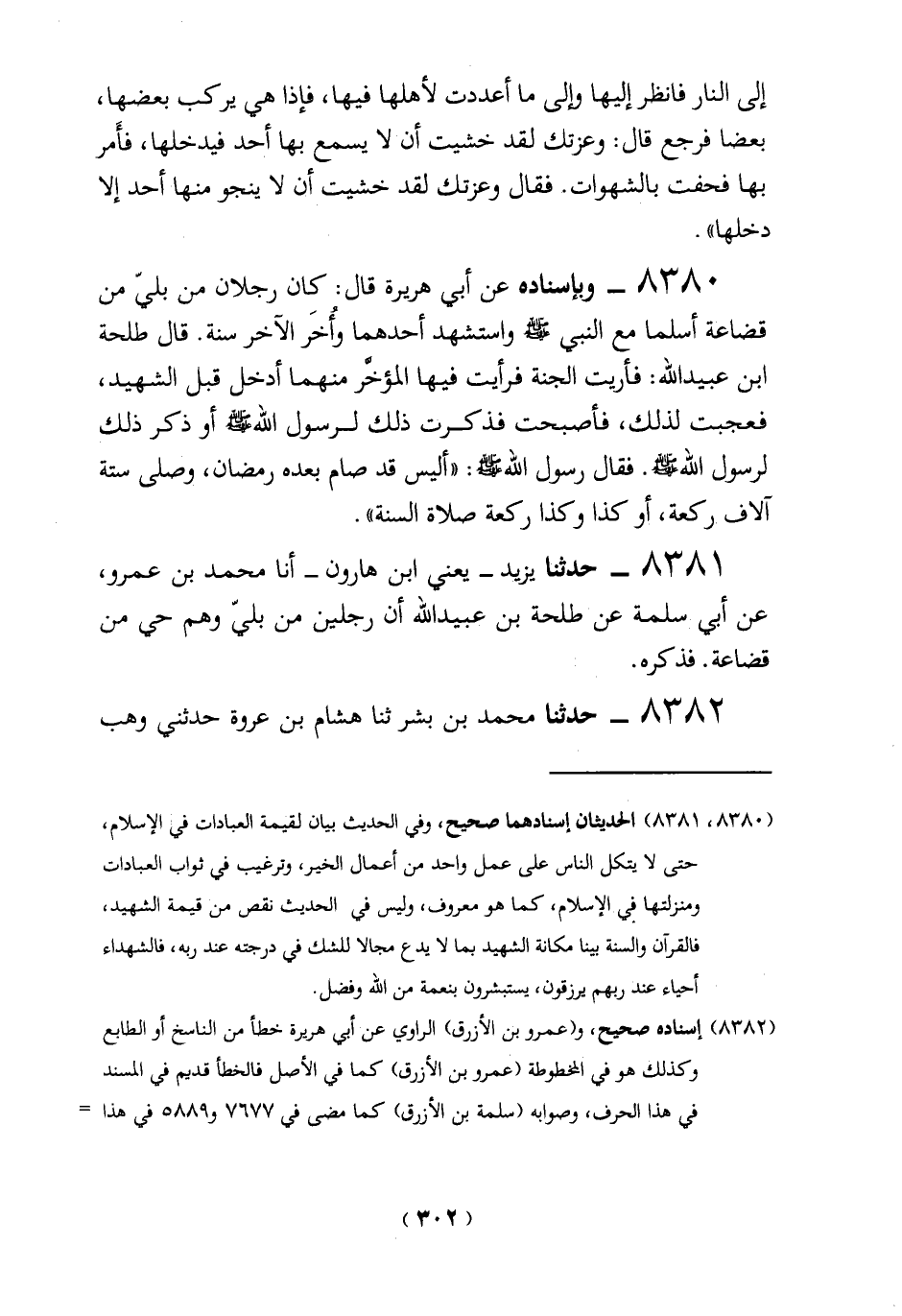 (8380، 8381) الحديثان إسنادهما صحيح، وفي الحديث بيان لقيمة العبادات في الإِسلام، حتى لا يتكل الناس على عمل واحد من أعمال الخير، وترغيب في ثواب العبادات ومنزلتها في الإِسلام، كما هو معروف، وليس في الحديث نقص من قيمة الشهيد، فالقرآن والسنة بينا مكانة الشهيد بما لا يدع مجالا للشك في درجته عند ربه، فالشهداء أحياء عند ربهم يرزقون، يستبشرون بنعمة من الله وفضل.