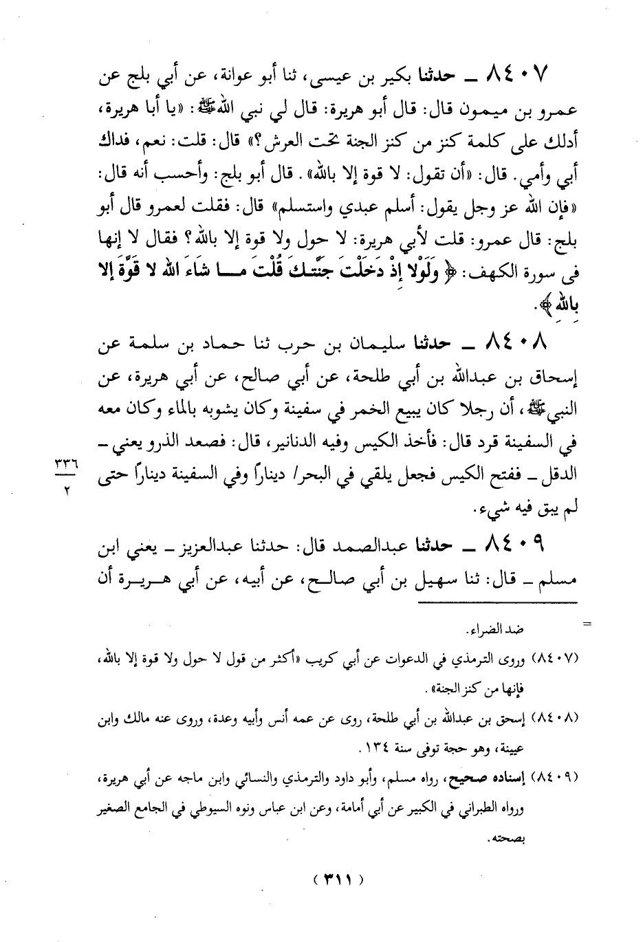 8407 - حدثنا بكير بن عيسى، ثنا أبو عوانة، عن أبي بلج عن عمرو بن ميمون قال: قال أبو هريرة: قال لي نبي الله - صلى الله عليه وسلم -: "يا أبا هريرة، أدلك على كلمة كنز من كنز الجنة تحت العرش؟ " قال: قلت: نعم، فداك أبي وأمي. قال: "أن تقول: لا قوة إلا بالله". قال أبو بلج: وأحسب أنه قال: "فإن الله عَزَّ وَجَلَّ يقول: أسلم عبدي واستسلم" قال: فقلت لعمرو قال أبو