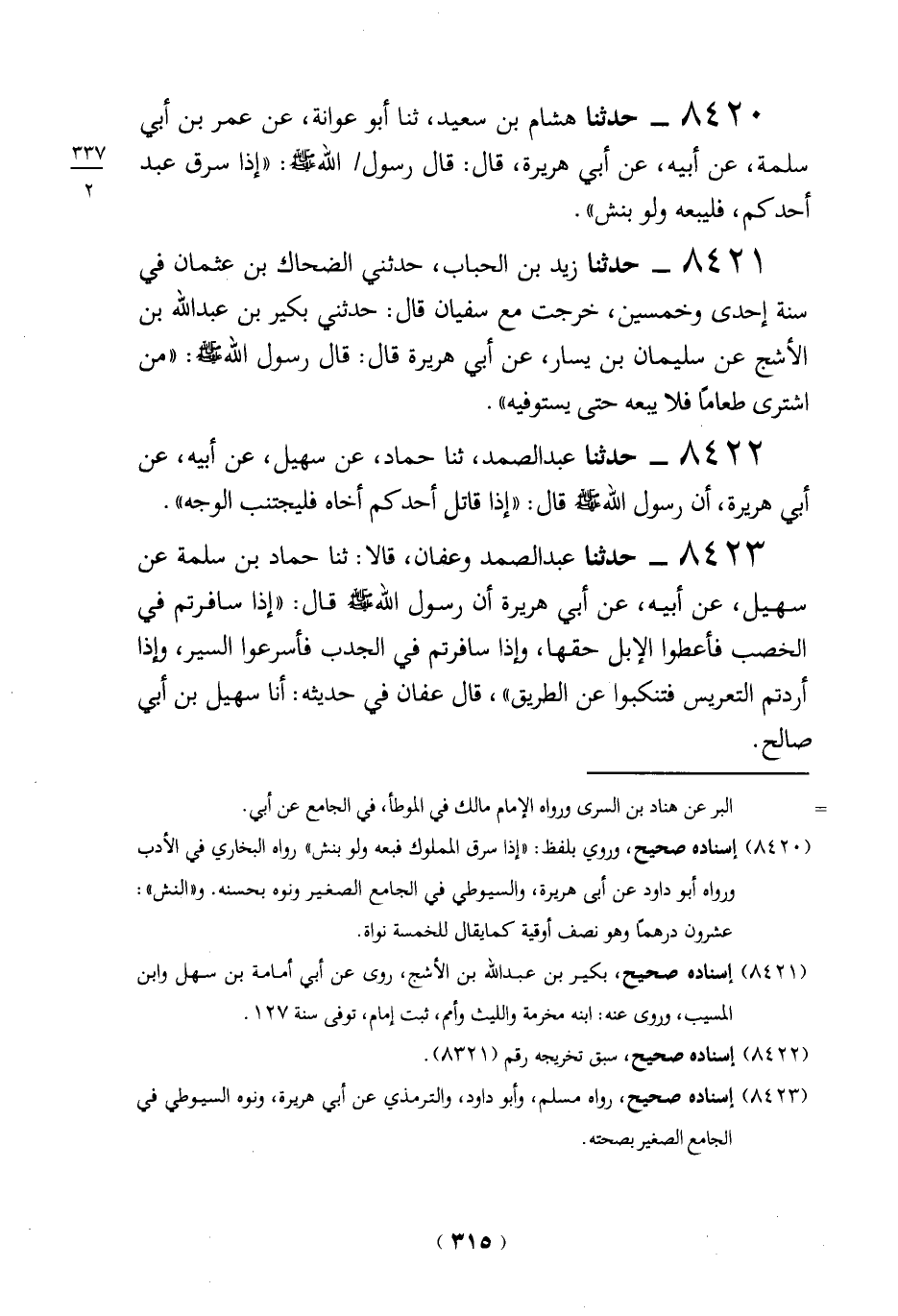 8422 - حدثنا عبد الصمد، ثنا حمّاد، عن سهيل، عن أبيه، عن أبي هريرة، أن رسول الله - صلى الله عليه وسلم - قال: "إذا قاتل أحدكم أخاه فليجتنب الوجه".