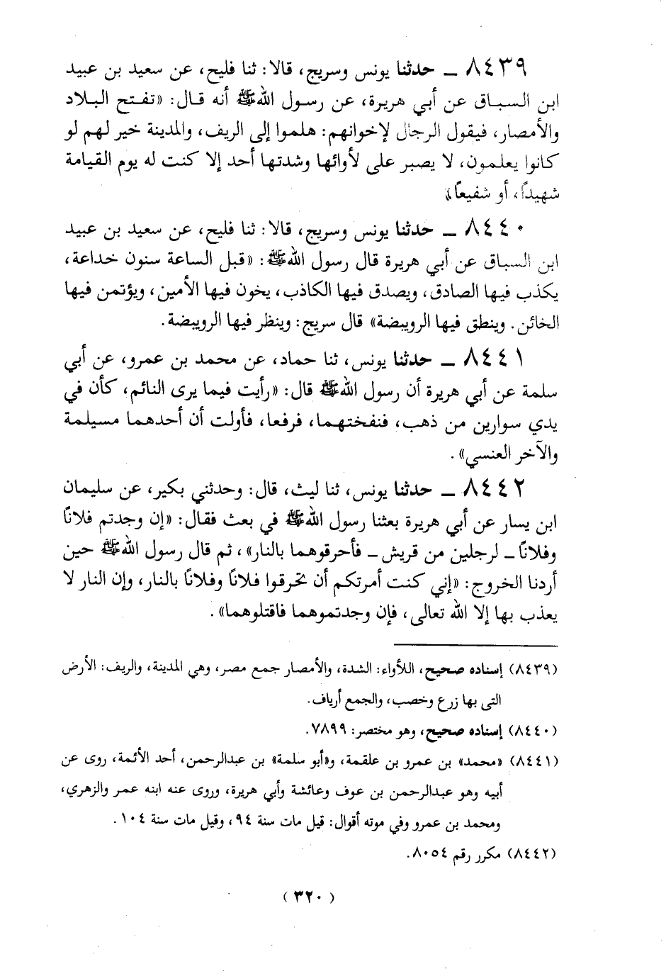 - حدثنا يونس وسريج، قالا: ثنا فليح، عن سعيد بن عبيد ابن السباق عن أبي هريرة، عن رسول الله - صلى الله عليه وسلم - أنه قال: "تفتح البلاد والأمصار، فيقول الرجال لإخوانهم: هلموا إلى الريف، والمدينة خير لهم لو كانوا يعلم لا يصبر على لأوائها وشدتها أحد إلا كنت له يوم القيامة