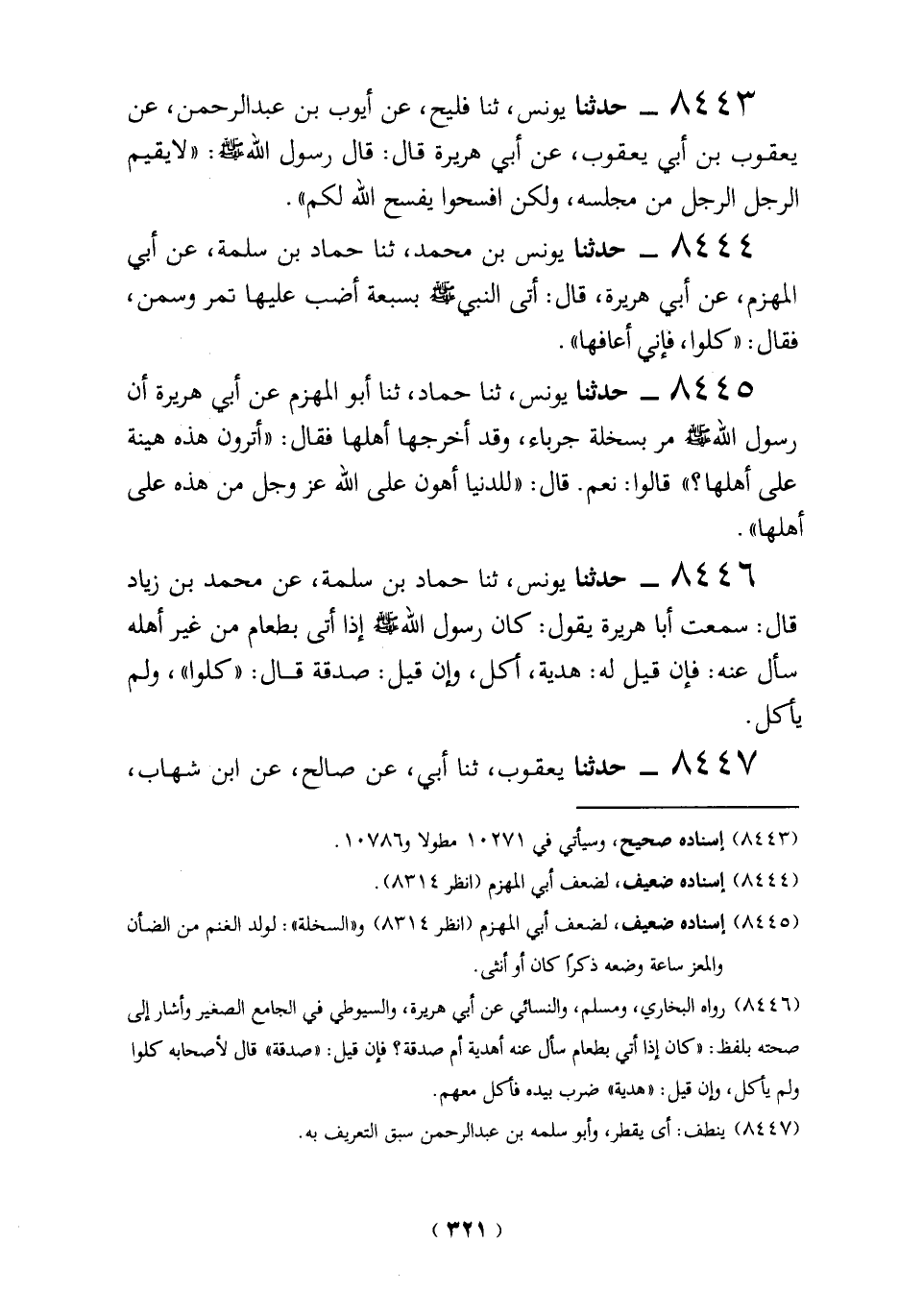 8446 - حدثنا يونس، ثنا حمّاد بن سلمة، عن محمَّد بن زياد قال: سمعت أبا هريرة يقول: كان رسول الله - صلى الله عليه وسلم - إذا أتى بطعام من غير أهله سأل عنه: فإن قيل له: هدية، أكل، وإن قيل: صدقة قال: "كلوا"، ولم يأكل.