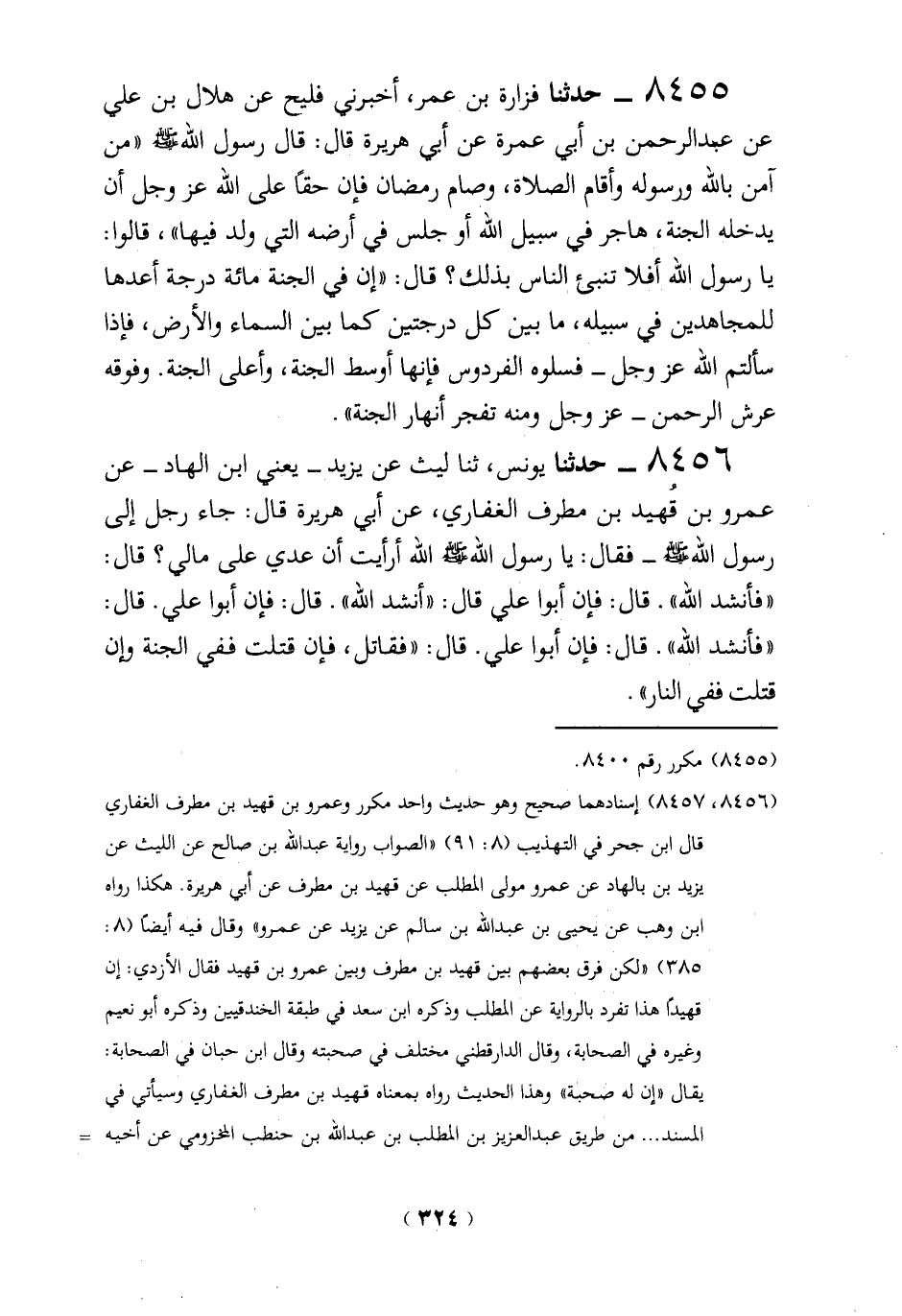 (8456، 8457) إسنادهما صحيح وهو حديث واحد مكرر وعمرو بن قهيد بن مطرف الغفاري قال ابن جحر في التهذيب (8: 91) "الصواب رواية عبد الله بن صالح عن الليث عن يزيد بن بالهاد عن عمرو مولى المطلب عن قهيد بن مطرف عن أبي هريرة. هكذا رواه ابن وهب عن يحيى بن عبد الله بن سالم عن يزيد عن عمرو" وقال فيه أيضاً (8: 385) "لكن فرق بعضهم بين قهيد بن مطرف وبين عمرو بن قهيد فقال الأزدي: إن قهيدًا هذا تفرد بالرواية عن المطلب وذكره ابن سعد في طبقة الخندقيين وذكره أبو نعيم وغيره في الصحابة، وقال الدارقطني مختلف في صحبته وقال ابن حبان في الصحابة: يقال "إن له صحبة" وهذا الحديث رواه بمعناه قهيد بن مطرف الغفاري وسيأتي في المسند ... من طريق عبد العزيز بن المطلب بن عبد الله بن حنطب المخزومي عن أخيه =