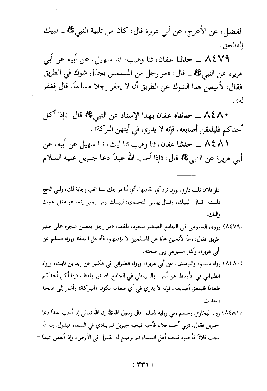 8479 - حدثنا عفان، ثنا وُهَيْب، ثنا سهيل، عن أبيه عن أبي هريرة عن النبي -صلي الله عليه وسلم - قال: "مرَّ رجل من المسلمين بجذل شوك في الطريق فقال: لأميطن هذا الشوك عن الطريق أن لا يعقر رجلاً مسلمًا. قال فغفر له".