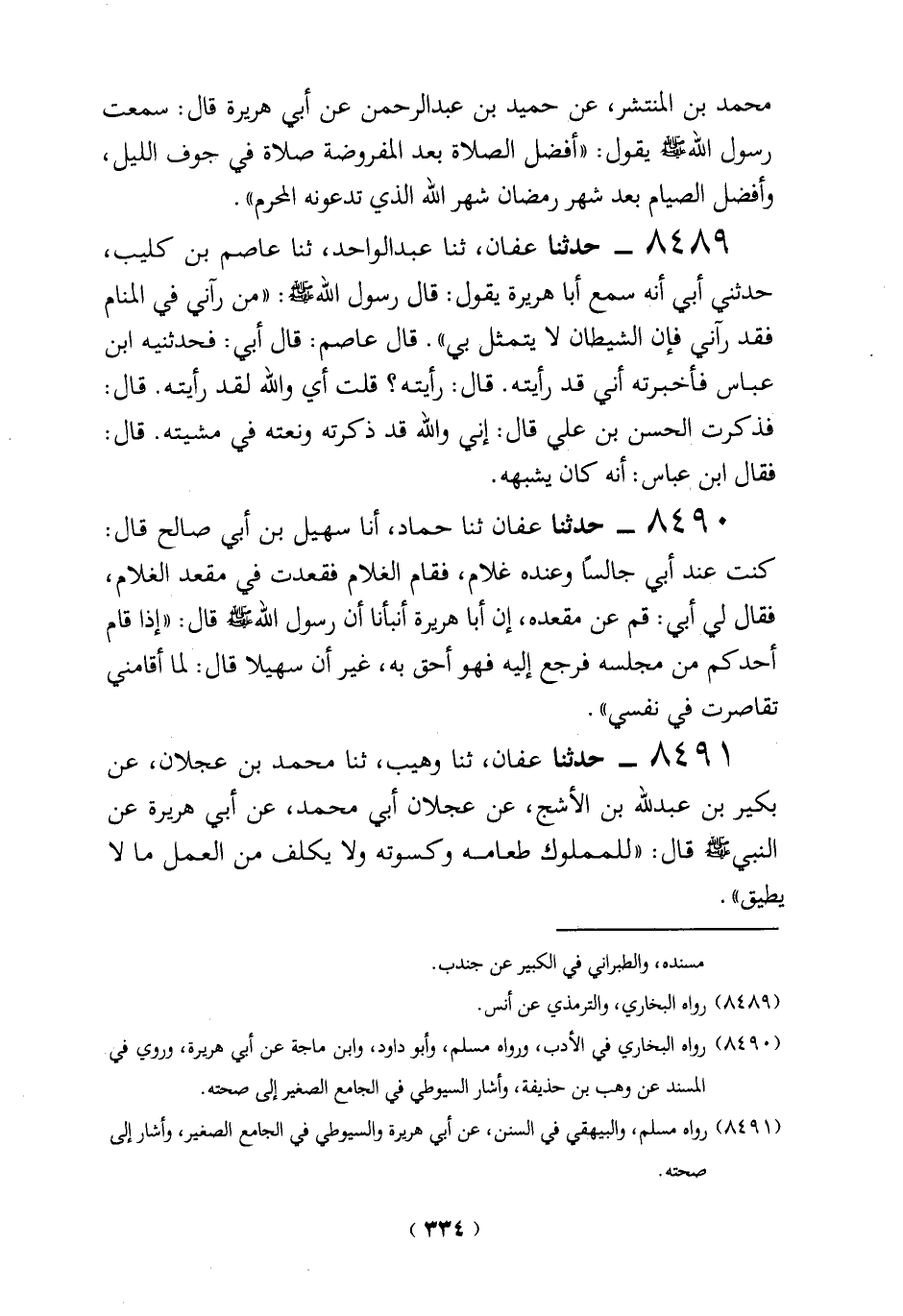 8491 - حدثنا عفان، ثنا وُهَيْب، ثنا محمَّد بن عجلان، عن بكير بن عبد الله بن الأشج، عن عجلان أبي محمَّد، عن أبي هريرة عن النبي -صلي الله عليه وسلم - قال: "للمملوك طعامه وكسوته ولا يكلف من العمل ما لا يطيق".