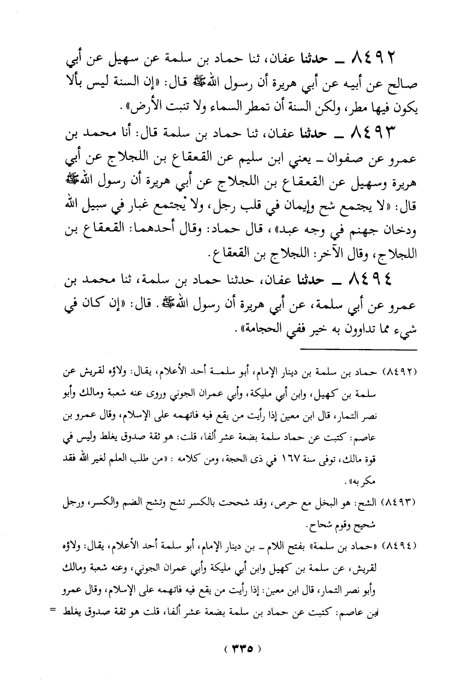 8492 - حدثنا عفان، ثنا حمّاد بن سلمة عن سهيل عن أبي صالح عن أبيه عن أبي هريرة أن رسول الله - صلى الله عليه وسلم - قال: "إن السنة ليس بألا يكون فيها مطر، ولكن السنة أن تمطر السماء ولا تنبت الأرض".
