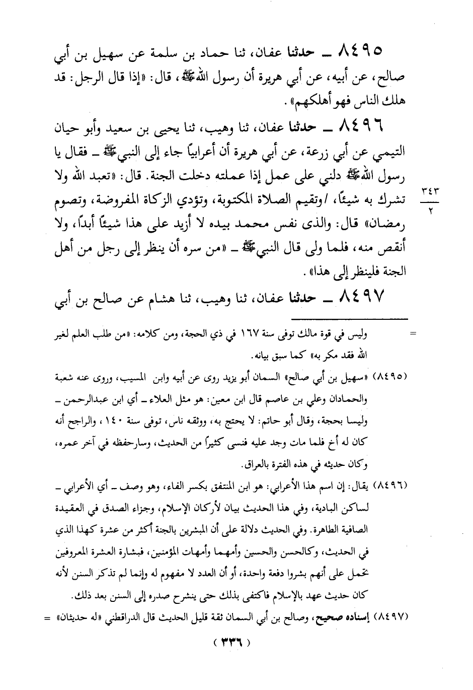 8496 - حدثنا عفان، ثنا وُهَيْب، ثنا يحيى بن سعيد وأبو حيان التيمي عن أبي زرعة، عن أبي هريرة أن أعرابيًا جاء إلى النبي -فقال يا رسول الله - صلى الله عليه وسلم - دلني على عمل إذا عملته دخلت الجنة. قال: "تعبد الله ولا تشرك به شيئاً، وتقيم الصلاة المكتوبة، وتؤفى ي الزكاة المفروضة، وتصوم رمضان" قال: والذي نفس محمَّد بيده لا أزيد على هذا شيئاً أبدًا، ولا أنقص منه، فلما ولى قال النبي -صلي الله عليه وسلم - "من سره أن ينظر إلى رجل من أهل الجنة فلينظر إلى هذا".