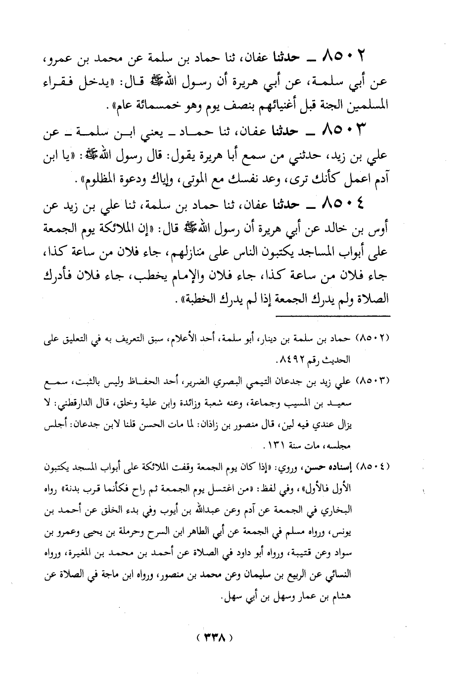 8502 - حدثنا عفان، ثنا حمّاد بن سلمة عن محمَّد بن عمرو، عن أبي سلمة، عن أبي هريرة أن رسول الله - صلى الله عليه وسلم - قال: "يدخل فقراء المسلمين الجنة قبل أغنيائهم بنصف يوم وهو خمسمائة عام".