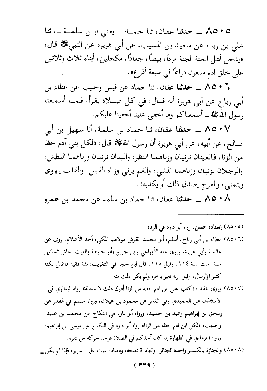 8507 - حدثنا عفان، ثنا حمّاد بن سلمة، أنا سهيل بن أبي صالح، عن أبيه، عن أبي هريرة أن رسول الله في قال: "الكل بني آدم حظ من الزنا، فالعينان تزنيان وزناهما النظر، واليدان تزنيان وزناهما البطش، والرجلان يزنيان وزناهما المشي، والفم يزني وزناه القبل، والقلب يهوى ويتمنى، والفرج يصدق ذلك أو يكذبه".