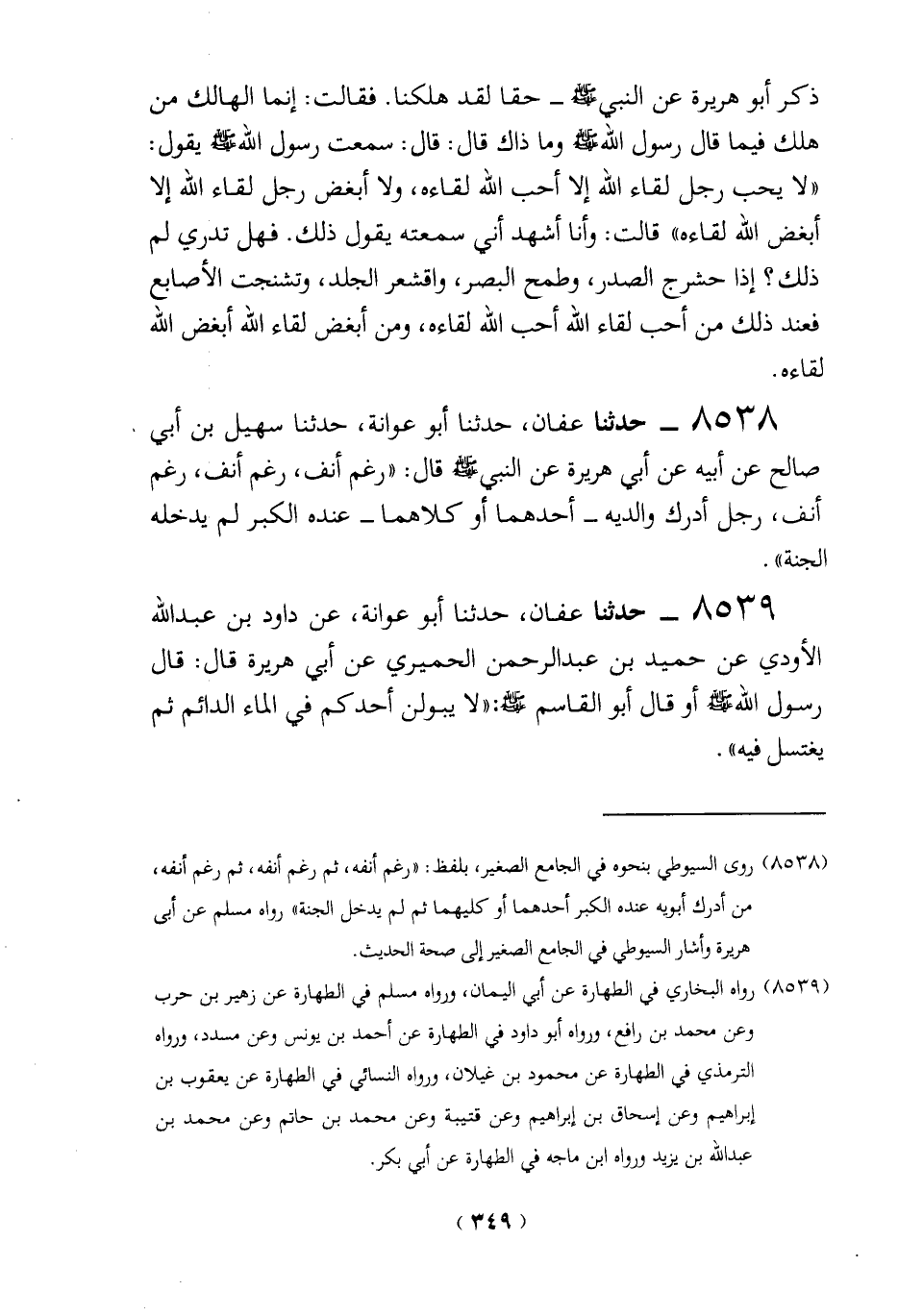 (8539) رواه البخاري في الطهارة عن أبي اليمان، ورواه مسلم في الطهارة عن زهير بن حرب وعن محمَّد بن رافع، ورواه أبو داود في الطهارة عن أحمد بن يونس وعن مسدد، ورواه الترمذي في الطهارة عن محمود بن غَيْلان، ورواه النسائي في الطهارة عن يعقوب بن إبراهيم وعن إسحق بن إبراهيم وعن قتيبة وعن محمَّد بن حاتم وعن محمَّد بن عبد الله بن يزيد ورواه ابن ماجه في الطهارة عن أبي بكر.