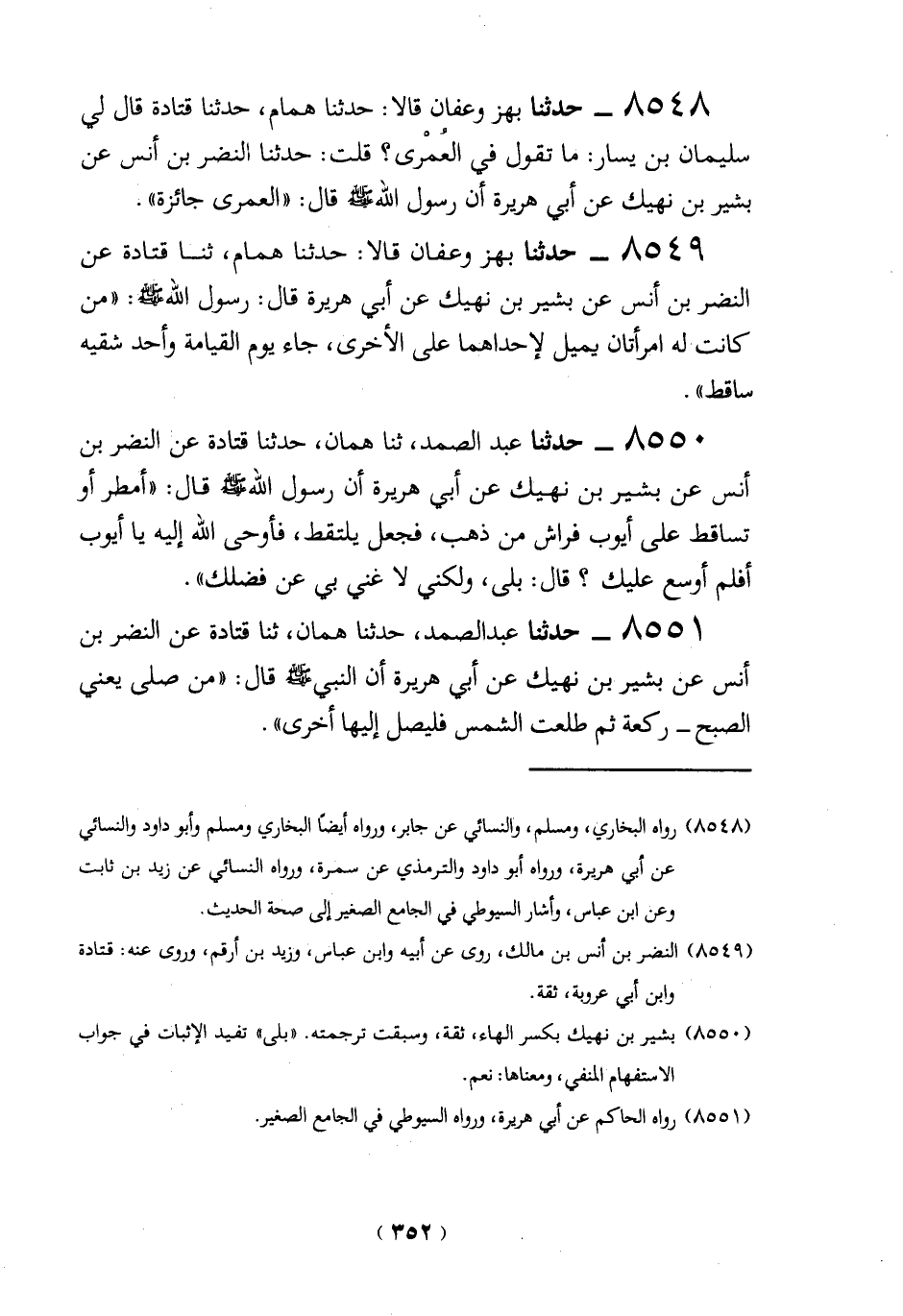 (8550) بشير بن نهيك بكسر الهاء، ثقة، وسبقت ترجمته. "بلى" تفيد الإثبات في جواب الاستفهام المنفى، ومعناها: نعم.