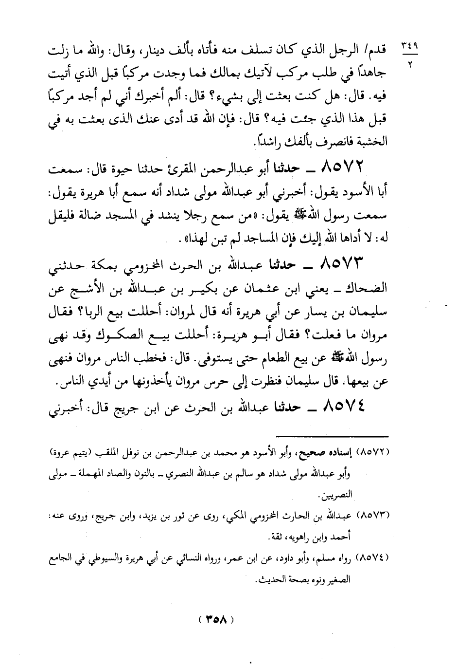 8573 - حدثنا عبد الله بن الحرث المخزومي بمكة حدثني الضحاك - يعني ابن عثمان عن بكير بن عبد الله بن الأشج عن سليمان بن يسار عن أبي هريرة أنه قال لمروان: أحللت بيع الربا؟ فقال مروان ما فعلت؟ فقال أبو هريرة: أحللت بيع الصكوك وقد نهى رسول الله -صلي الله عليه وسلم -عن بيع الطعام حتى يستوفى. قال: فخطب الناس مروان فنهى عن بيعها. قال سليمان فنظرت إلى حرس مروان يأخذونها من أيدي الناس.