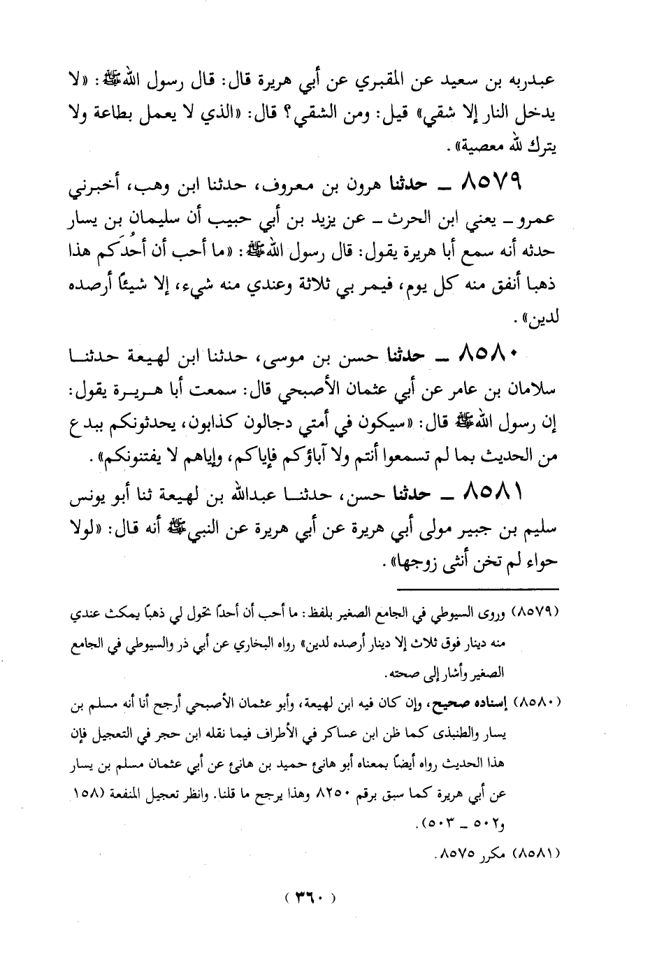8580 - حدثنا حسن بن موسى، حدثنا ابن لهيعة حدثنا سلامان بن عامر عن أبي عثمان الأصبحي قال: سمعت أبا هريرة يقول: إن رسول الله -صلي الله عليه وسلم - قال: "سيكون في أمتي دجالون كذابون، يحدثونكم ببدع من الحديث بما لم تسمعوا أنتم ولا آباؤكم فإياكم، وإياهم لا يفتنونكم".