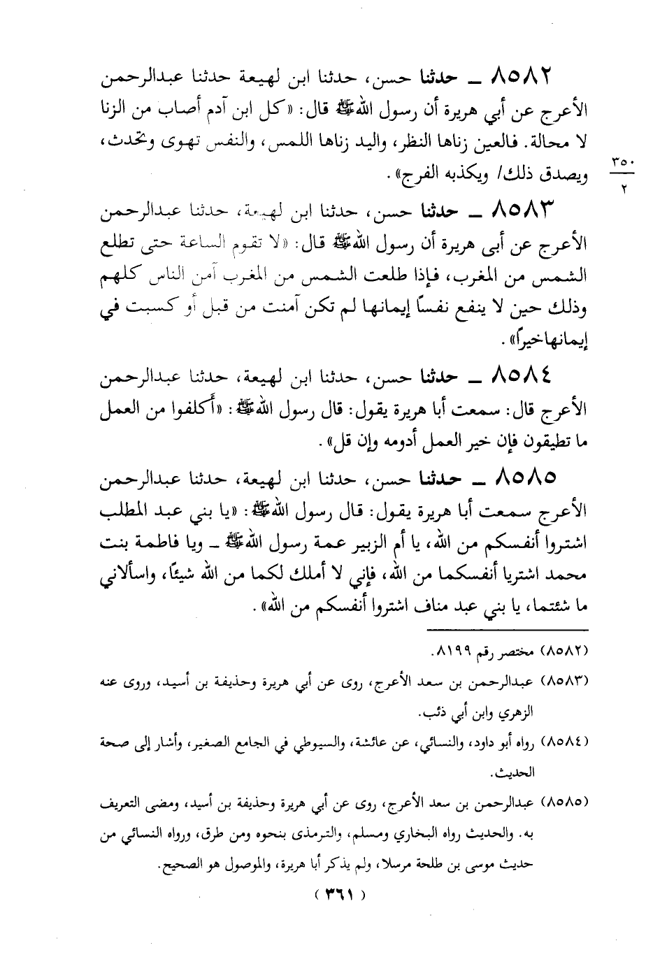 8585 - حدثنا حسن، حدثنا ابن لهيعة، حدثنا عبد الرحمن الأعرج سمعت أبا هريرة يقول: قال رسول الله -صلي الله عليه وسلم -: "يا بني عبد المطلب اشتروا أنفسكم من الله، يا أم الزُّبير عمة رسول الله -صلي الله عليه وسلم - ويا فاطمة بنت محمَّد اشتريا أنفسكما من الله، فإني لا أملك لكما من الله شيئاً، واسألاني ما شئتما، يا بني عبد مناف اشتروا أنفسكم من الله".