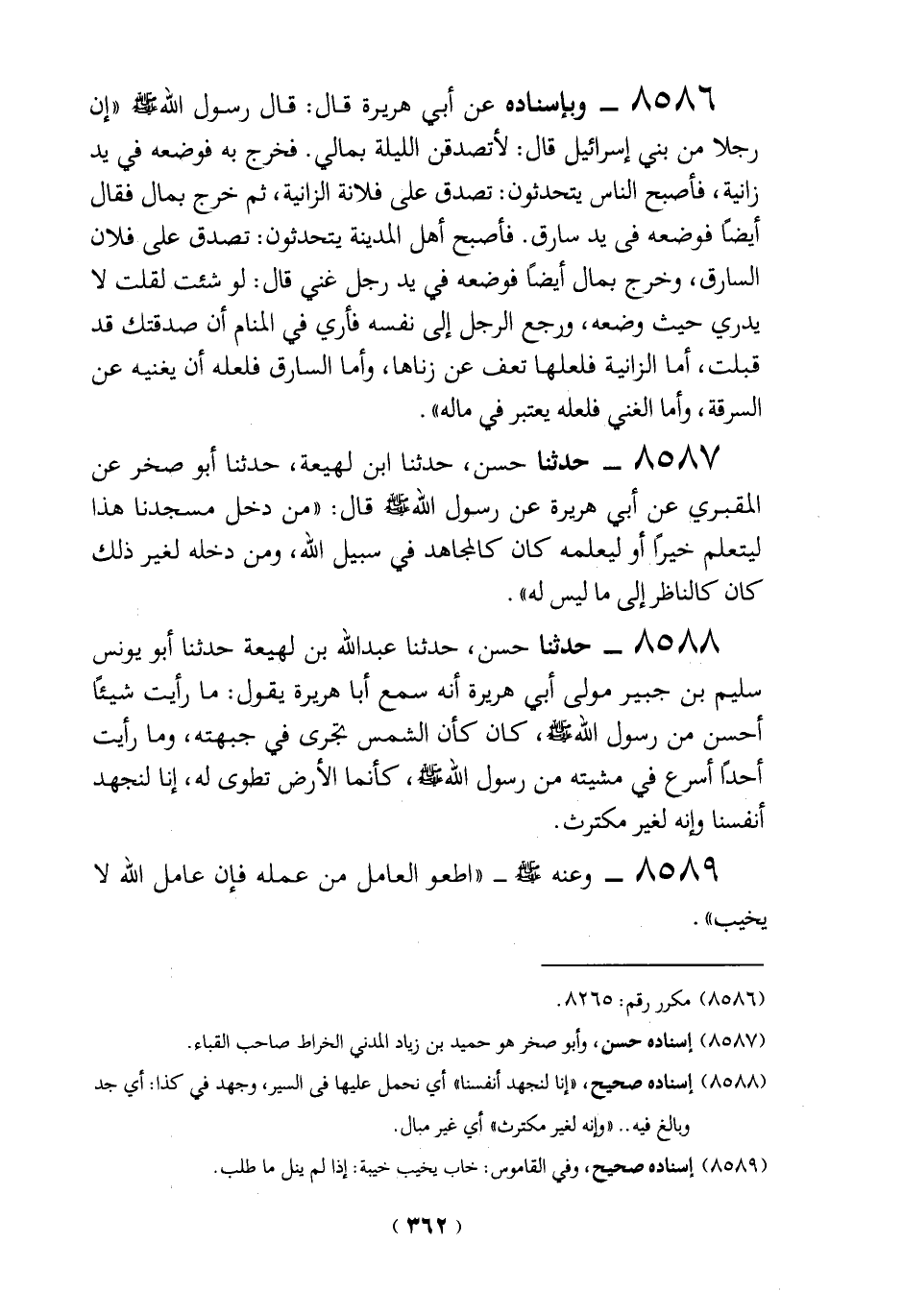 8586 - وبإسناده عن أبي هريرة قال: قال رسول الله -صلي الله عليه وسلم- "إن رجلاً من بني إسرائيل قال: لأتصدقن الليلة بمالي. فخرج به فوضعه في يد زانية، فأصبح الناس يتحدثون: تصدق على فلانة الزانية، ثم خرج بمال فقال أيضاً فوضعه في يد سارق. فأصبح أهل المدينة يتحدثون: تصدق على فلان السارق، وخرج بمال أيضاً فوضعه في يد رجل غني قال: لو شئت لقلت لا يدري حيث وضعه، ورجع الرجل إلى نفسه فأري في المنام أن صدقتك قد قبلت، أما الزانية فلعلها تعف عن زناها، وأما السارق فلعله أن يغنيه عن السرقة، وأما الغني فلعله يعتبر في ماله".