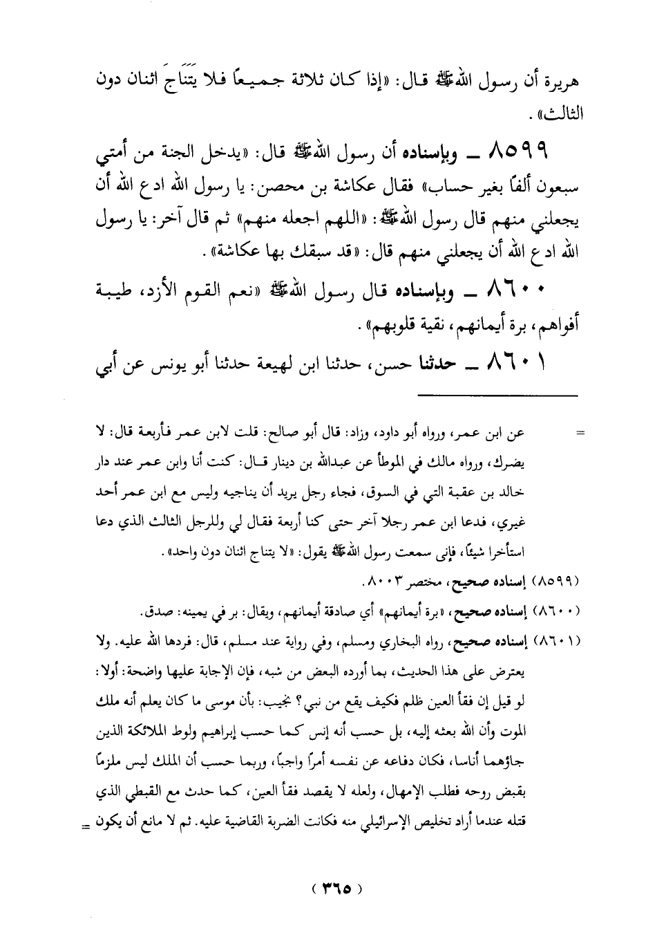 (8601) إسناده صحيح، رواه البخاري ومسلم، وفي رواية عند مسلم، قال: فردها الله عليه. ولا يعترض على هذا الحديث، بما أورده البعض من شبه، فإن الإجابة عليها واضحة: أولا: لو قيل إن فقأ العين ظلم فكيف يقع من نبي؟ نجيب: بأن موسى ما كان يعلم أنه ملك الموت وأن الله بعثه إليه، بل حسب أنه أنس كما حسب إبراهيم ولوط الملائكة الدين جاؤهما أناسا، فكان دفاعه عن نفسه أمرًا واجبًا، وربما حسب أن الملك ليس ملزمًا بقبض روحه فطلب الإمهال، ولعله لا يقصد فقأ العين، كما حدث مع القبطي الذي قتله عندما أراد تخليص الإسرائيلي منه فكانت الضربة القاضية عليه. ثم لا مانع أن يكون =