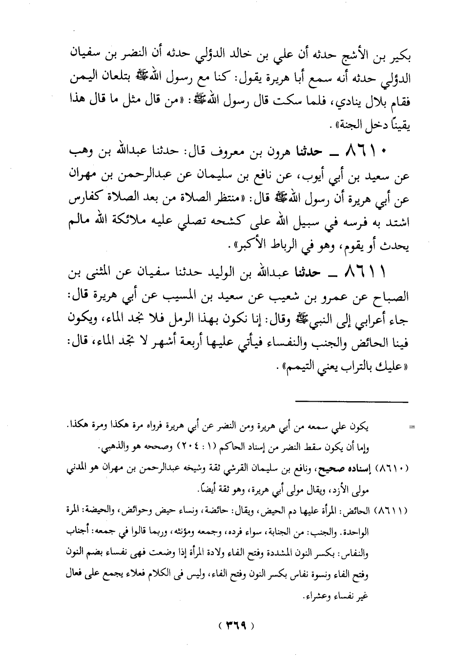 (8610) إسناده صحيح، ونافع بن سليمان القرشي ثقة وشيخه عبد الرحمن بن مهران هو المدني مولى الأزد، ويقال مولى أبي هريرة، وهو ثقة أيضاً.