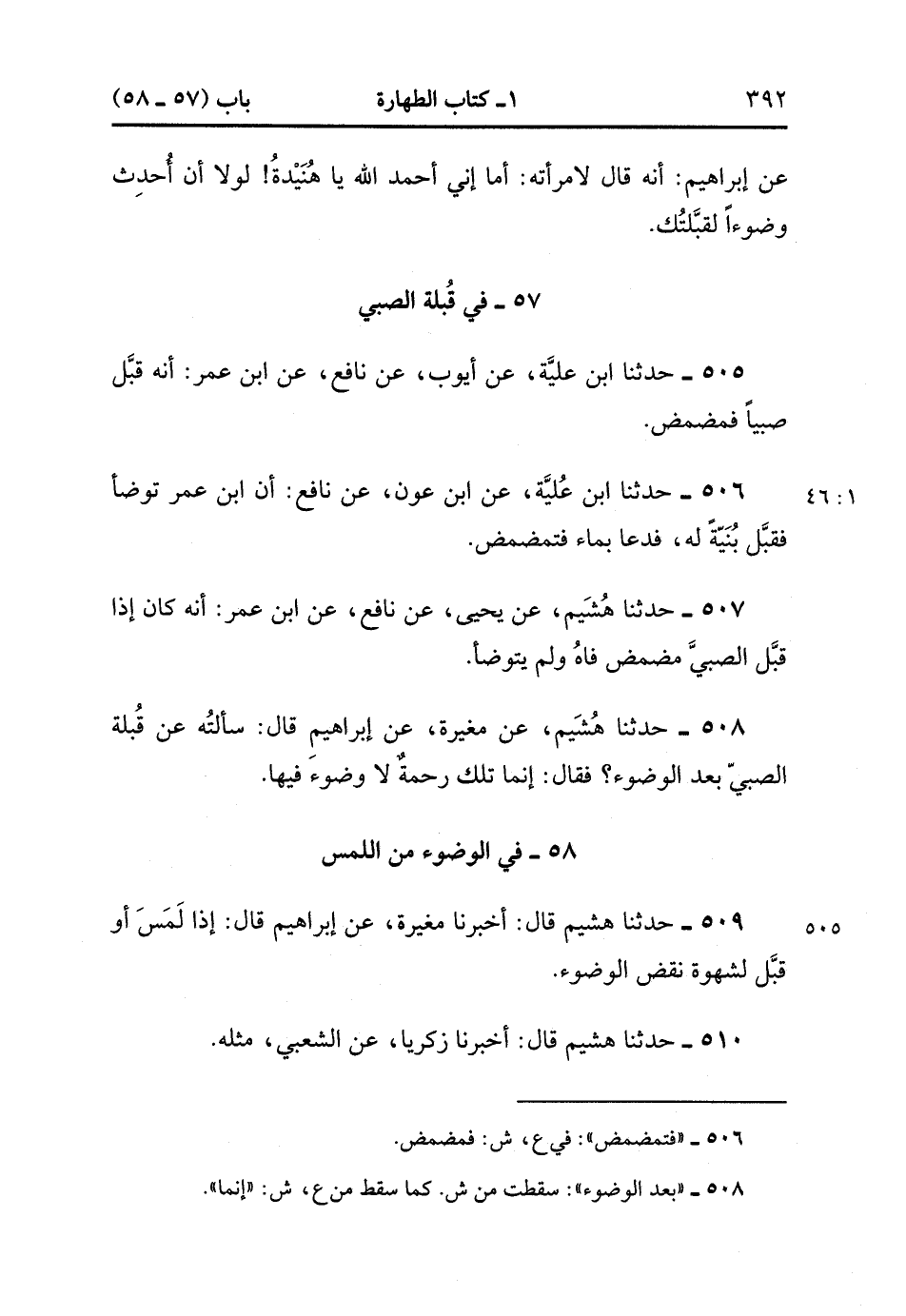 508- حَدَّثَنَا هُشَيْمٌ ، عَنْ مُغِيرَةَ ، عَنْ إبْرَاهِيمَ ، قَالَ : سَأَلْتُهُ عَنْ قُبْلَةِ الصَّبِيِّ بَعْدَ الْوُضُوءِ ؟ فَقَالَ : إنَّمَا تِلْكَ رَحْمَةٌ لا وُضُوءَ فِيهَا.