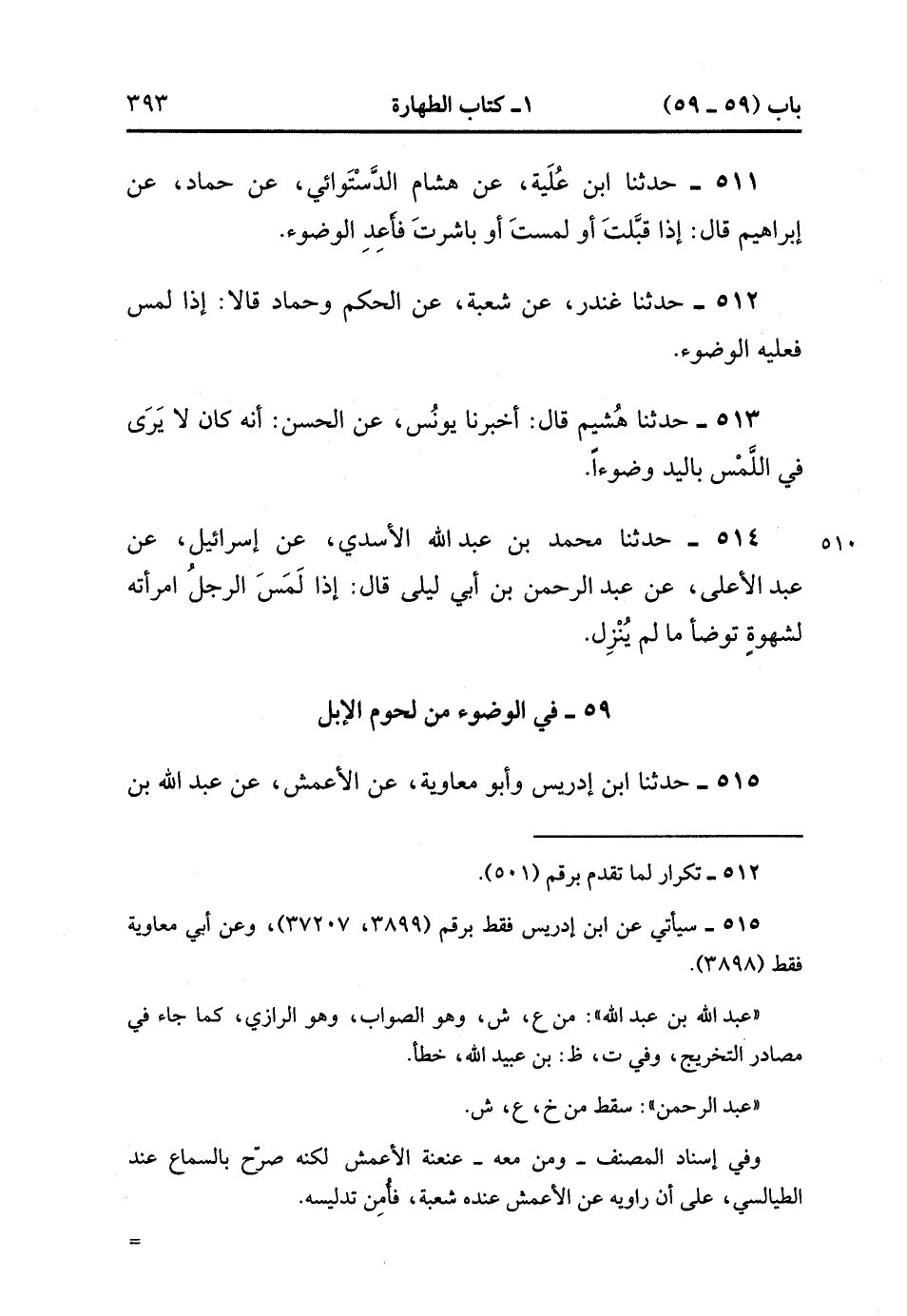 514- حَدَّثَنَا مُحَمَّدُ بْنُ عَبْدِ اللهِ الأَسَدِيُّ ، عَنْ إسْرَائِيلَ ، عَنْ عَبْدِ الأَعْلَى ، عَنْ عَبْدِ الرَّحْمَنِ بْنِ أَبِي لَيْلَى ، قَالَ : إذَا لَمَسَ الرَّجُلُ امْرَأَتَهُ لِشَهْوَةٍ تَوَضَّأَ مَا لَمْ يُنْزِلْ. (1/46).