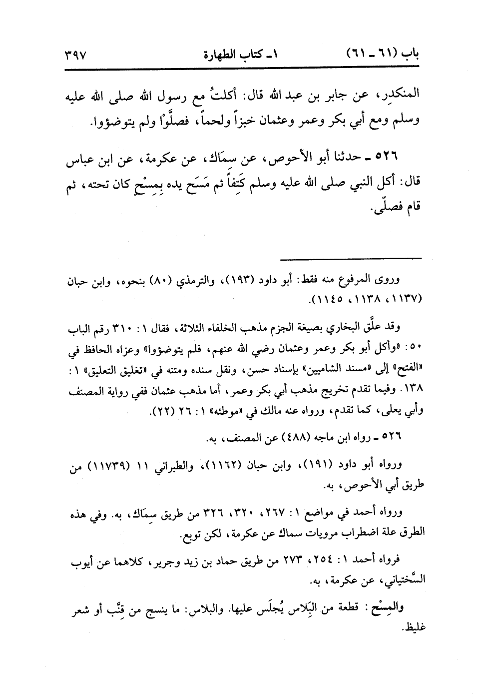 526- حَدَّثَنَا أَبُو الأَحْوَصِِ ، عَنْ سِمَاكٍ ، عَنْ عِكْرِمَةَ ، عَنِ ابْنِ عَبَّاسٍ ، قَالَ : أَكَلَ النَّبِيُّ صَلَّى الله عَلَيْهِ وَسَلَّمَ كَتِفًا ثُمَّ مَسَحَ يَدَهُ بِمِسْحٍ كَانَ تَحْتَهُ ، ثُمَّ قَامَ فَصَلَّى. (1/47).