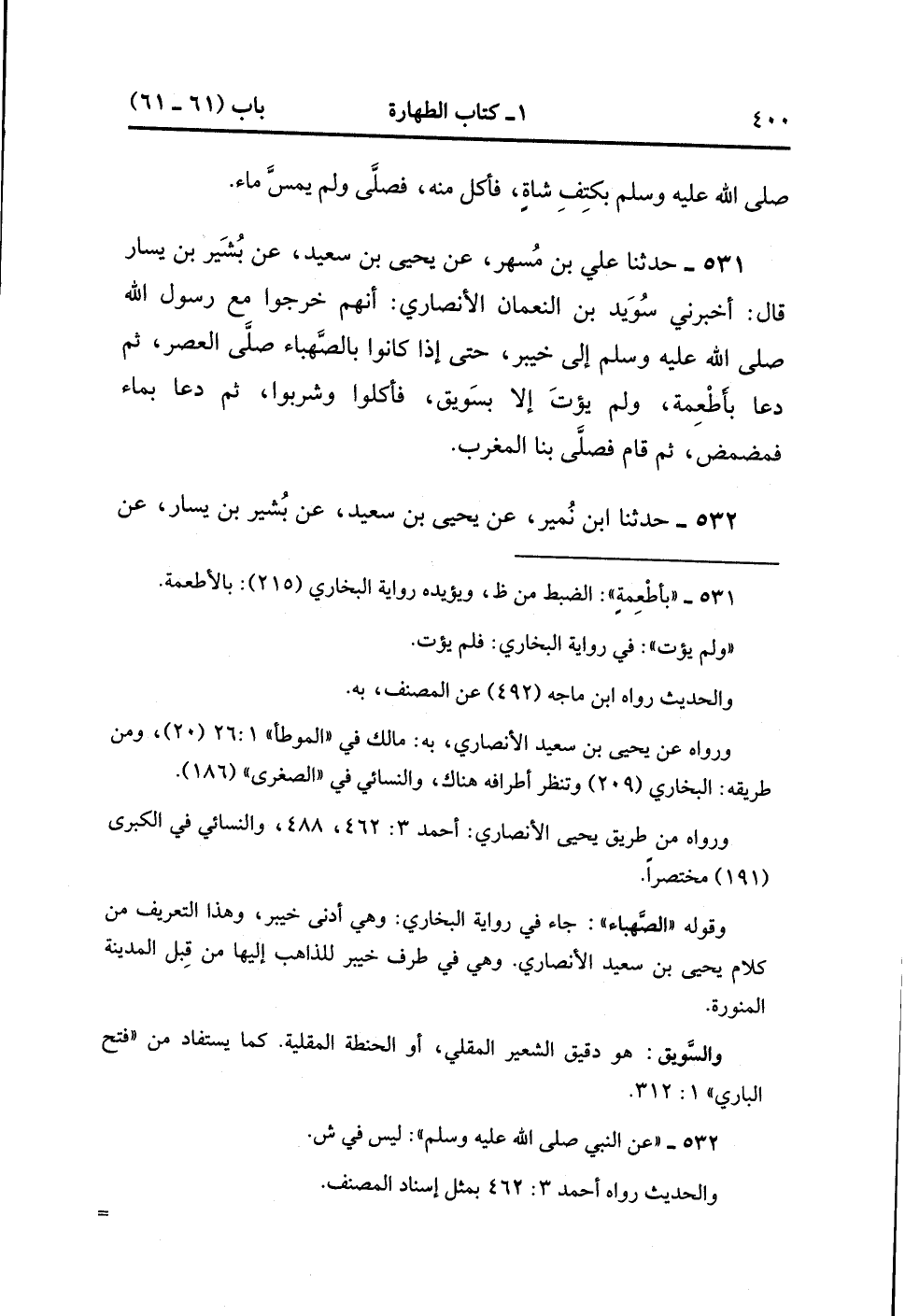 532- حَدَّثَنَا ابْنُ نُمَيْرٍ ، عَنْ يَحْيَى بْنِ سَعِيدٍ ، عَنْ بُشَيْرِ بْنِ يَسَارٍ ، عَنْ سُوَيْد بْنِ النُّعْمَانِ ، عَنِ النَّبِيِّ صَلَّى الله عَلَيْهِ وَسَلَّمَ ، بِمِثْلِهِ ، وَزَادَ فِيهِ : وَمَضْمَضْنَا مَعَهُ وَمَا مَسَّ مَاءً. (1/48).