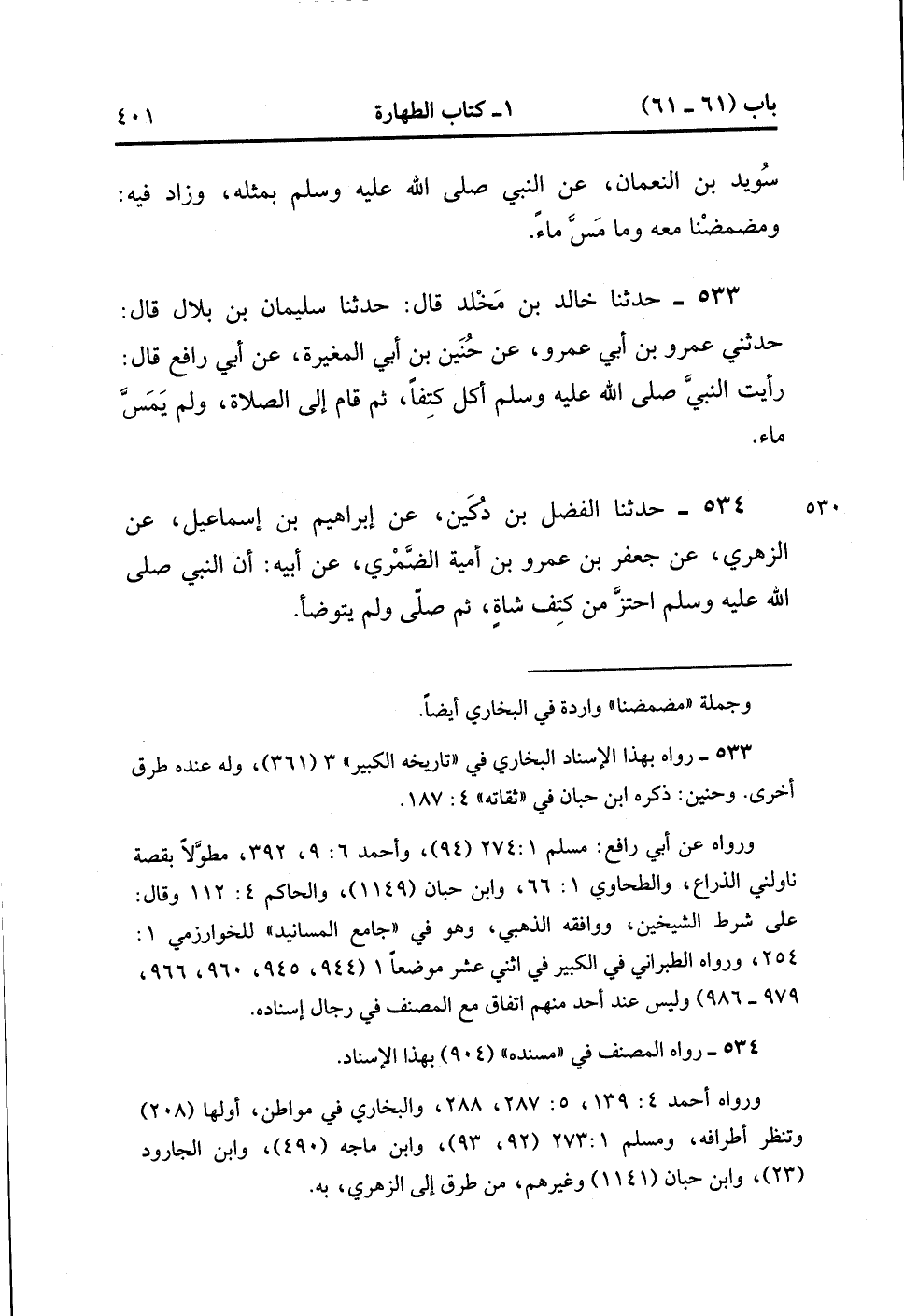 534- حَدَّثَنَا الْفَضْلُ بْنُ دُكَيْنٍ ، عَنْ إبْرَاهِيمَ بْنِ إسْمَاعِيلَ ، عَنِ الزُّهْرِيِّ ، عَنْ جَعْفَرِ بْنِ عَمْرو بْنِ أُمَيَّةَ الضَّمْرِيِّ ، عَنْ أَبِيهِ ؛ أَنَّ النَّبِيَّ صَلَّى الله عَلَيْهِ وَسَلَّمَ احْتَزَّ مِنْ كَتِفِ شَاةٍ ، ثُمَّ صَلَّى ، وَلَمْ يَتَوَضَّأْ. (1/48).