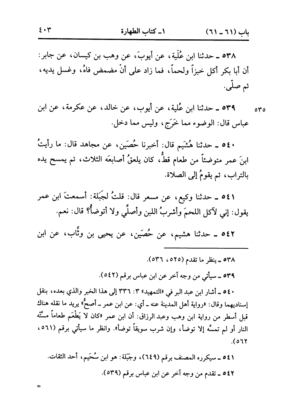 541- حَدَّثَنَا وَكِيعٌ ، عَنْ مِسْعَرٍ ، قَالَ : قُلْتُ لِجَبَلَةَ : أَسَمِعْتَ ابْنَ عُمَرَ يَقُولُ : إِنِّي لآكُلُ اللَّحْمَ وَأَشْرَبُ اللَّبَنَ وَأُصَلِّي وَلا أَتَوَضَّأُ ؟ قَالَ : نَعَمْ. (1/49).
