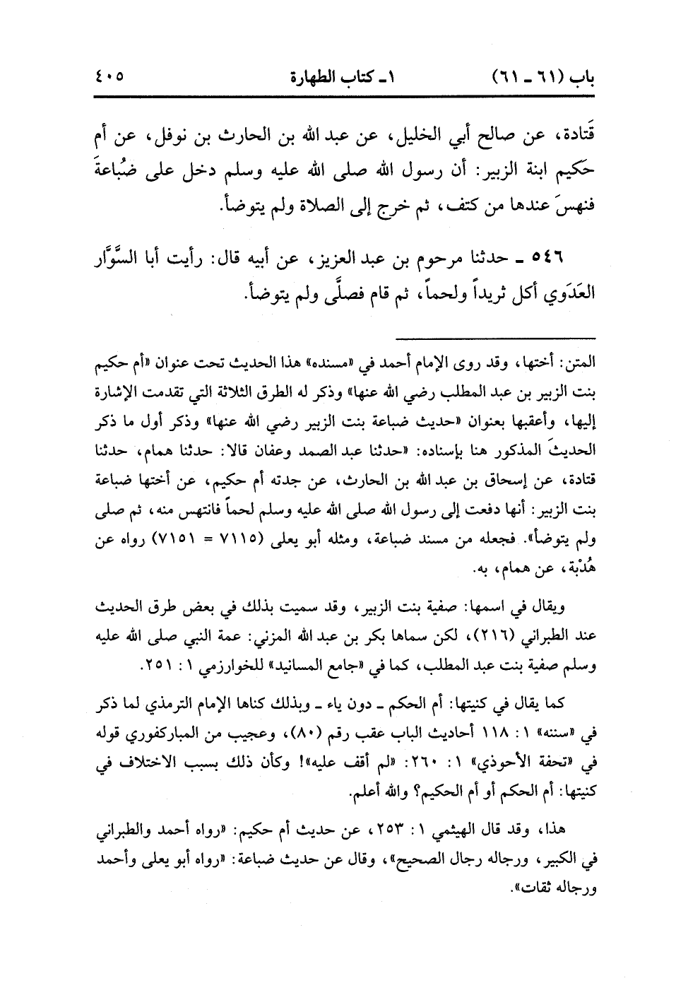 545- حَدَّثَنَا يَزِيدُ بْنُ هَارُونَ , قَالَ : أَخْبَرَنَا سَعِيدُ بْنُ أَبِي عَرُوبَةَ ، عَنْ قَتَادَةَ ، عَنْ صَالِحٍ أَبِي الْخَلِيلِ ، عَنْ عَبْدِ اللهِ بْنِ الْحَارِثِ بْنِ نَوْفَلٍ ، عَنْ أُمِّ حَكِيمٍ ابْنَةِ الزُّبَيْرِ ؛ أَنَّ رَسُولَ اللهِ صَلَّى الله عَلَيْهِ وَسَلَّمَ دَخَلَ عَلَى ضُبَاعَةَ ؛ فَنَهَسَ عِنْدَهَا مِنْ كَتِفٍ ، ثُمَّ خَرَجَ إلَى الصَّلاَةِ ، وَلَمْ يَتَوَضَّأْ.