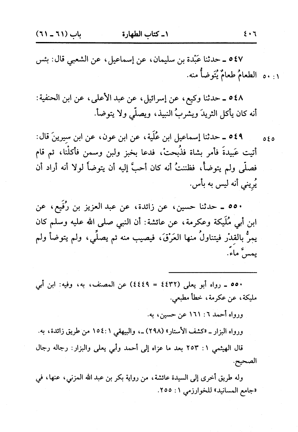 550- حَدَّثَنَا حُسَيْنٌ ، عَنْ زَائِدَةَ ، عَنْ عَبْدِ الْعَزِيزِ بْنِ رُفَيْعٍ ، عَنِ ابْنِ أَبِي مُلَيْكَةَ ، وَعِكْرِمَةَ ، عَنْ عَائِشَةَ ؛ أَنَّ النَّبِيَّ صَلَّى الله عَلَيْهِ وَسَلَّمَ كَانَ يَمُرُّ بِالْقِدْرِ ، فَيَتَنَاوَلُ مِنْهَا الْعَرْقَ فَيُصِيبُ مِنْهُ ، ثُمَّ يُصَلِّي وَلَمْ يَتَوَضَّأْ ، وَلَمْ يَمَسَّ مَاءً. (1/50).