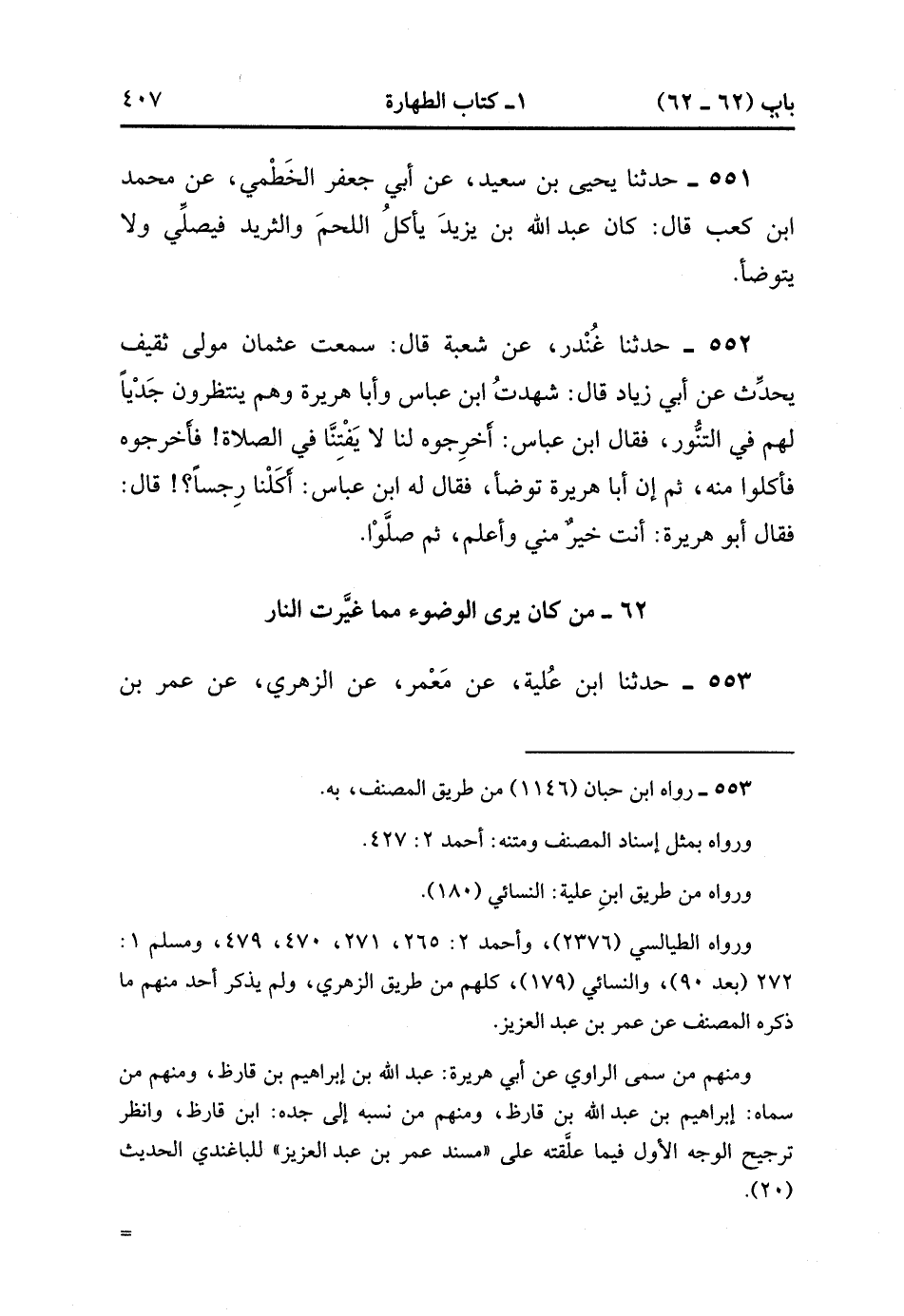 552- حَدَّثَنَا غُنْدَرٌ ، عَنْ شُعْبَةَ ، قَالَ : سَمِعْتُ عُثْمَانَ مَوْلَى ثَقِيفٍ يُحَدِّثُ ، عَنْ أَبِي زِيَادٍ ، قَالَ : شَهِدْتُ ابْنَ عَبَّاسٍ وَأَبَا هُرَيْرَةَ وَهُمْ يَنْتَظِرُونَ جَدْيًا لَهُمْ فِي التَّنُّورِ ، فَقَالَ ابْنُ عَبَّاسٍ : أَخْرِجُوهُ لَنَا لا يَفْتِنَّا فِي الصَّلاَةِ ، فَأَخْرَجُوهُ فَأَكَلُوا مِنْهُ ، ثُمَّ إنَّ أَبَا هُرَيْرَةَ تَوَضَّأَ ، فَقَالَ لَهُ ابْنُ عَبَّاسٍ : أَكَلْنَا رِجْسًا ؟! قَالَ : فَقَالَ أَبُو هُرَيْرَةَ : أَنْتَ خَيْرٌ مِنِّي وَأَعْلَمُ ، ثُمَّ صَلَّوْا. (1/50).