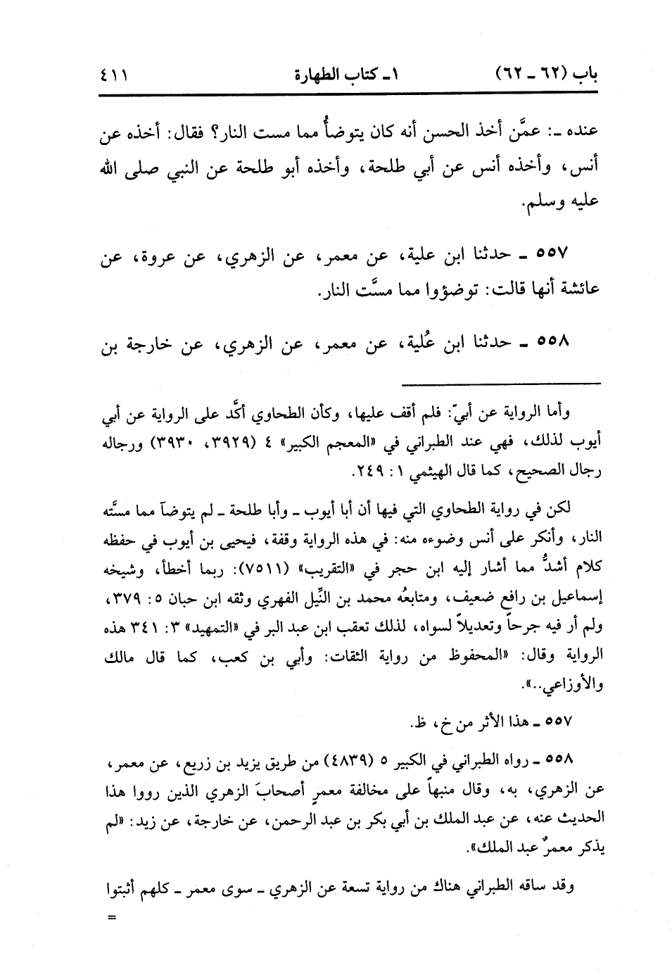 558- حَدَّثَنَا ابْنُ عُلَيَّةَ ، عَنْ مَعْمَرٍ ، عَنِ الزُّهْرِيِّ ، عَنْ خَارِجَةَ بْنِ زَيْدٍ ، عَنْ زَيْدِ بْنِ ثَابِتٍ ، أَنَّهُ قَالَ : تَوَضَّؤُوا مِمَّا مَسَّتِ النَّارُ. (1/51).