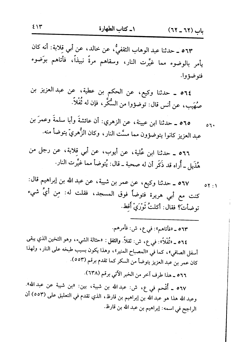 567- حَدَّثَنَا وَكِيعٌ ، عَنْ عُمَرَ بْنِ شَيْبَةَ ، عَنْ عَبْدِ اللهِ بْنِ إبْرَاهِيمَ ، قَالَ : كُنْتُ مَعَ أَبِي هُرَيْرَةَ ، فَتَوَضَّأَ فَوْقَ الْمَسْجِدِ ، فَقُلْتُ لَهُ : مِنْ أَيِّ شَيْءٍ تَوَضَّأْتَ ؟ فَقَالَ : أَكَلْتُ ثَوْرَيْ أَقِطٍ. (1/51).