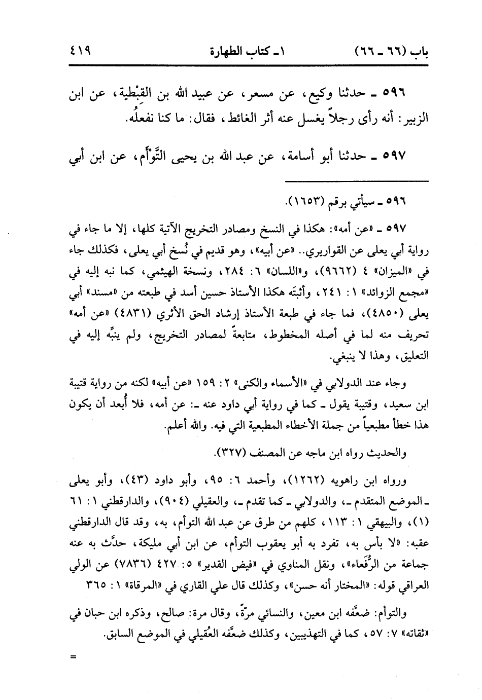 596- حَدَّثَنَا وَكِيعٌ ، عَنْ مِسْعَرٍ ، عَنْ عُبَيْدِ اللهِ ابْنِ الْقِبْطِيَّةِ ، عَنِ ابْنِ الزُّبَيْرِ ؛ أَنَّهُ رَأَى رَجُلاً يَغْسِلُ عَنْهُ أَثَرَ الْغَائِطِ ، فَقَالَ : مَا كُنَّا نَفْعَلُهُ. (1/54).