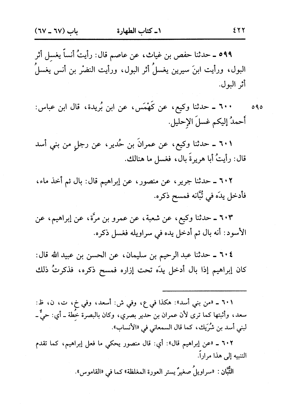 604- حَدَّثَنَا عَبْدُ الرَّحِيمِ بْنُ سُلَيْمَانَ ، عَنِ الْحَسَنِ بْنِ عُبَيْدِ اللهِ ، قَالَ : كَانَ إبْرَاهِيمُ إذَا بَالَ أَدْخَلَ يَدَهُ تَحْتَ إزَارِهِ فَمَسَحَ ذَكَرَهُ ، فَذَكَرْتُ ذَلِكَ لِطَلْحَةَ فَأَعْجَبَهُ ذَلِكَ. (1/54).