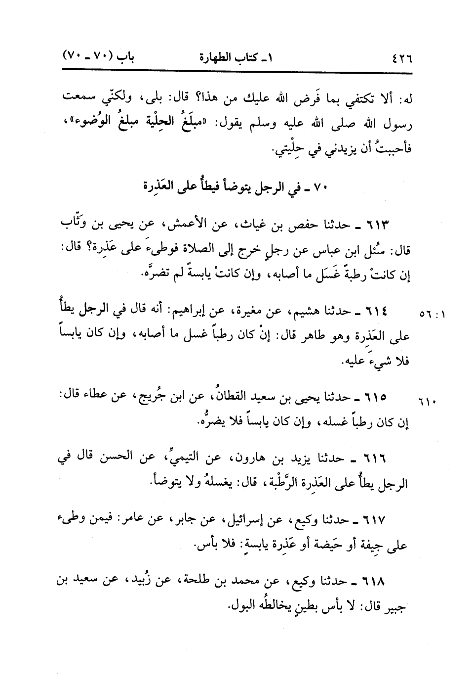 618- حَدَّثَنَا وَكِيعٌ ، عَنْ مُحَمَّدِ بْنِ طَلْحَةَ ، عَنْ زُبَيْدٍ ، عَنْ سَعِيدِ بْنِ جُبَيْرٍ ، قَالَ : لا بَأْسَ بِطِينٍ يُخَالِطُهُ الْبَوْلُ. (1/56).