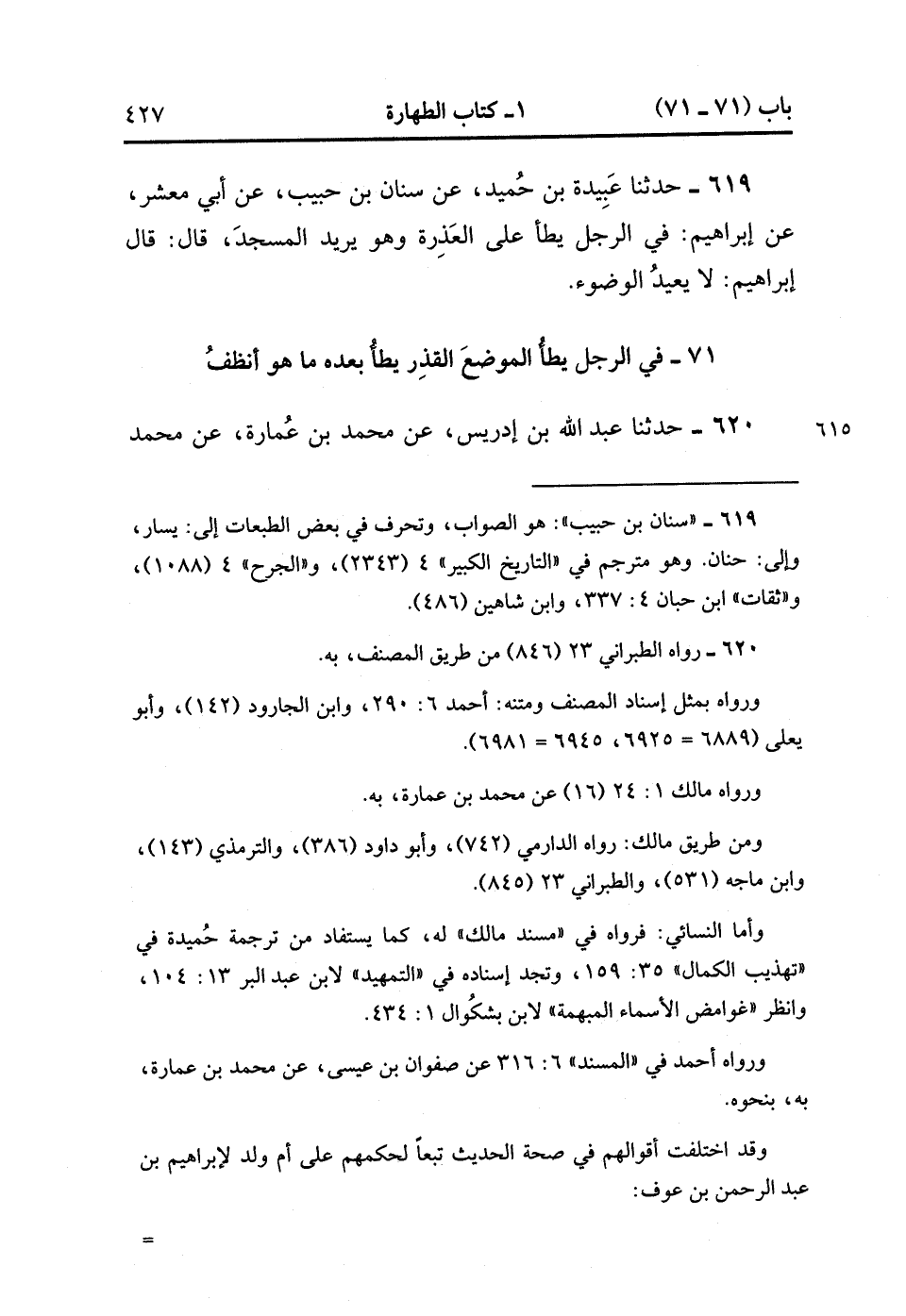 620- حَدَّثَنَا عَبْدُ اللهِ بْنُ إدْرِيسَ ، عَنْ مُحَمَّدِ بْنِ عُمَارَةَ ، عَنْ مُحَمَّدِ بْنِ إِبْرَاهِيمَ ، عَنْ أُمِّ وَلَدٍ لإِبْرَاهِيمَ بْنِ عَبْدِ الرَّحْمَنِ بْنِ عَوْفٍ ، قَالَتْ : كُنْتُ أُطِيلُ ذَيْلِي ، فَأَمُرُّ بِالْمَكَانِ الْقَذِرِ وَالْمَكَانِ الطَّيِّبِ ، فَدَخَلْتُ عَلَى أُمِّ سَلَمَةَ فَسَأَلْتُهَُا ، فَقَالَتْ أُمُّ سَلَمَةَ : سَمِعْتُ رَسُولَ اللهِ صَلَّى الله عَلَيْهِ وَسَلَّمَ يَقُولُ : يُطَهِّرُهُ مَا بَعْدَهُ. (1/56).