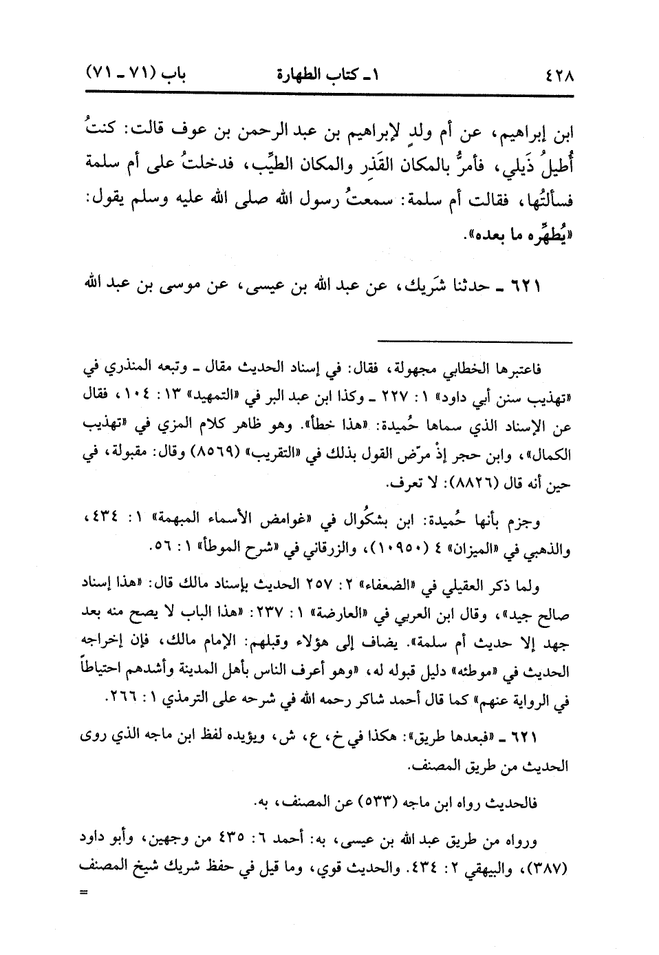 621- حَدَّثَنَا شَرِيكٌ ، عَنْ عَبْدِ اللهِ بْنِ عِيسَى ، عَنْ مُوسَى بْنِ عَبْدِ اللهِ بْنِ يَزِيدَ ، عَنِ امْرَأَةٍ مِنْ بَنِي عَبْدِ الأَشْهَلِ ، أَنَّهَا سَأَلَتِ النَّبِيَّ صَلَّى الله عَلَيْهِ وَسَلَّمَ ؛ إِنَّ بَيْنِي وَبَيْنَ الْمَسْجِدِ طَرِيقًا قَذِرًا ؟ قَالَ : فَبَعْدَهَا طَرِيقٌ أَنْظَفَ مِنْهَا ؟ قَالَتْ : نَعَمْ ، قَالَ : هَذِهِ بِهَذِهِ. (1/56).