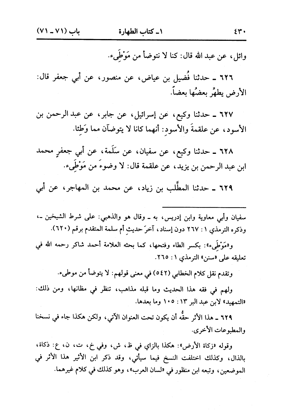 628- حَدَّثَنَا وَكِيعٌ ، عَنْ سُفْيَانَ ، عَنْ سَلَمَةَ ، عَنْ أَبِي جَعْفَرٍ مُحَمَّدِ بْنِ عَبْدِ الرَّحْمَنِ بْنِ يَزِيدَ ، عَنْ عَلْقَمَةَ ، قَالَ : لا وُضُوءَ مِنْ مَوْطِىءٍ.