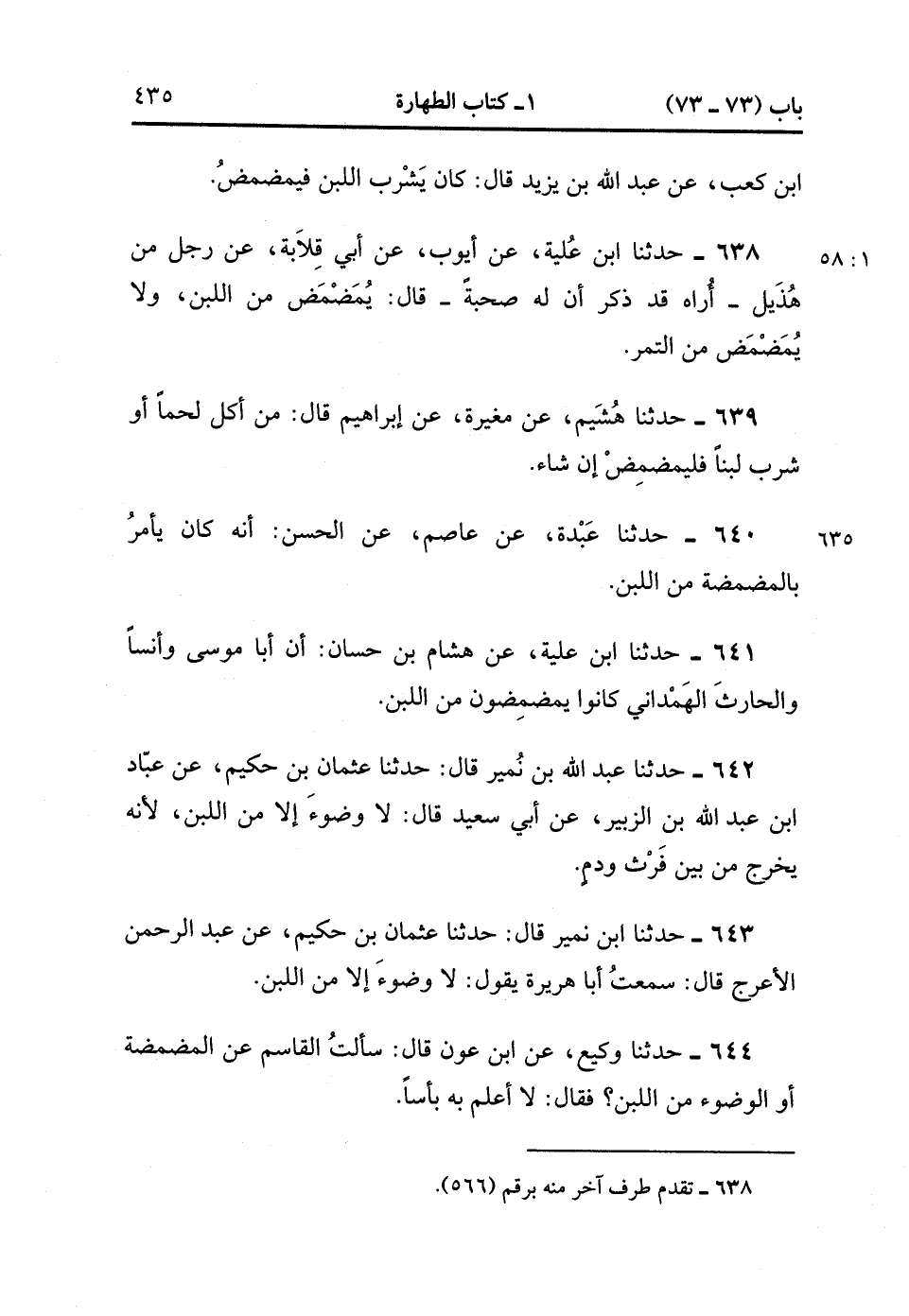 644- حَدَّثَنَا وَكِيعٌ ، عَنِ ابْنِ عَوْنٍ ، قَالَ : سَأَلْتُ الْقَاسِمَ عَنِ الْمَضْمَضَةِ ، أَوِ الْوُضُوءِ مِنَ اللَّبَنِ ؟ فَقَالَ : لا أَعْلَمُ بِهِ بَأْسًا. (1/58).