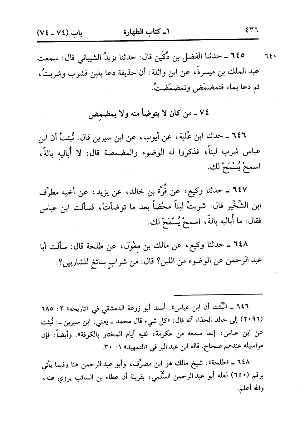648- حَدَّثَنَا وَكِيعٌ ، عَنْ مَالِكِ بْنِ مِغْوَلٍ ، عَنْ طَلْحَةَ ، قَالَ : سَأَلْتُ أَبَا عَبْدِ الرَّحْمَنِ عَنِ الْوُضُوءِ مِنَ اللَّبَنِ ؟ قَالَ : مِنْ شَرَابٍ سَائِغٍ لِلشَّارِبِينَ ؟. (1/58).