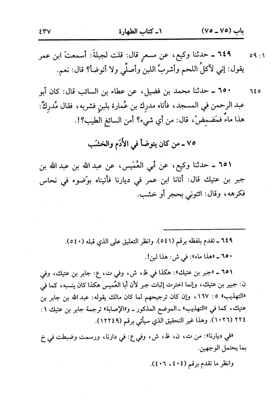 649- حَدَّثَنَا وَكِيعٌ ، عَنْ مِسْعَرٍ ، قَالَ : قُلْتُ لِجَبَلَةَ : أَسَمِعْت ابْنَ عُمَرَ يَقُولُ : إنِّي لآكُلُ اللَّحْمَ وَأَشْرَبُ اللَّبَنَ ، وَأُصَلِّي وَلا أَتَوَضَّأُ ؟ قَالَ : نَعَمْ. (1/58)