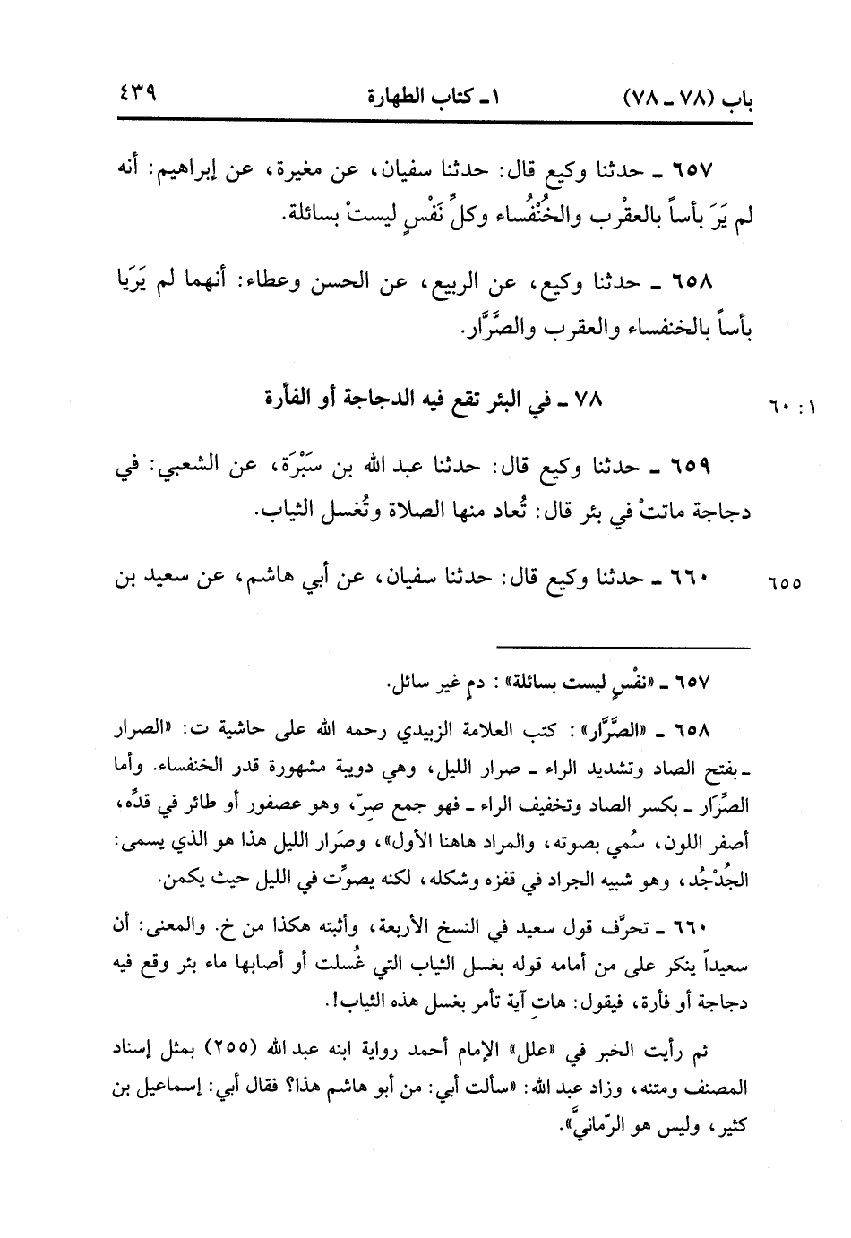 660- حَدَّثَنَا وَكِيعٌ , قَالَ : حدَّثَنَا سُفْيَانُ ، عَنْ أَبِي هَاشِمٍ ، عَنْ سَعِيدِ بْنِ جُبَيْرٍ ، قَالَ : اقرأ عليَّ آيةً بغسل الثياب. (1/60).